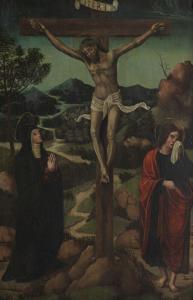 Christ en croix, Vierge et Saint Jean, huile sur panneau, 47x30...