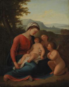 Vierge à l'Enfant avec deux anges, huile sur toile, monogrammée...