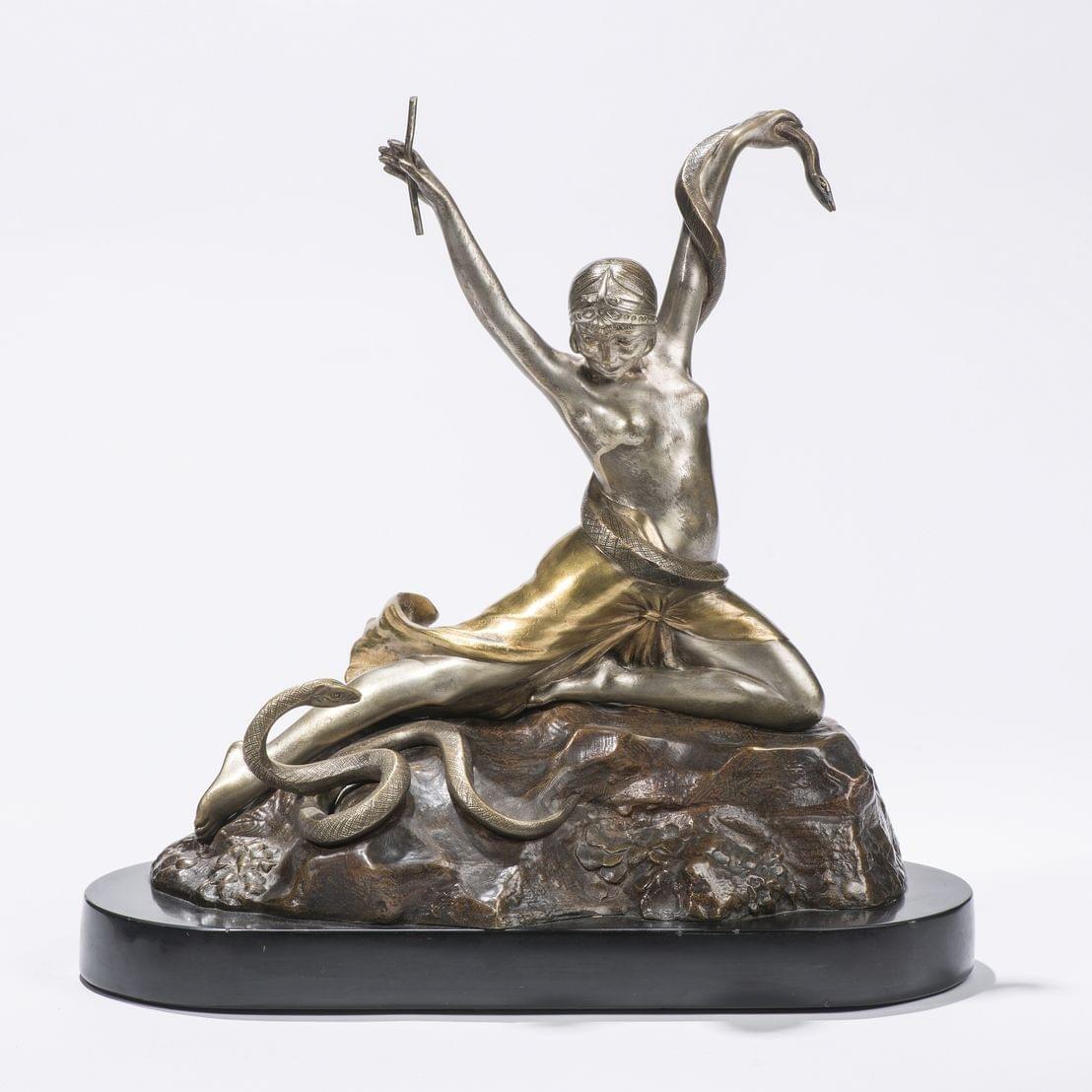 Charmeuse de serpent, bronze à patine argenté et médaille, signature illisible, H 34 cm