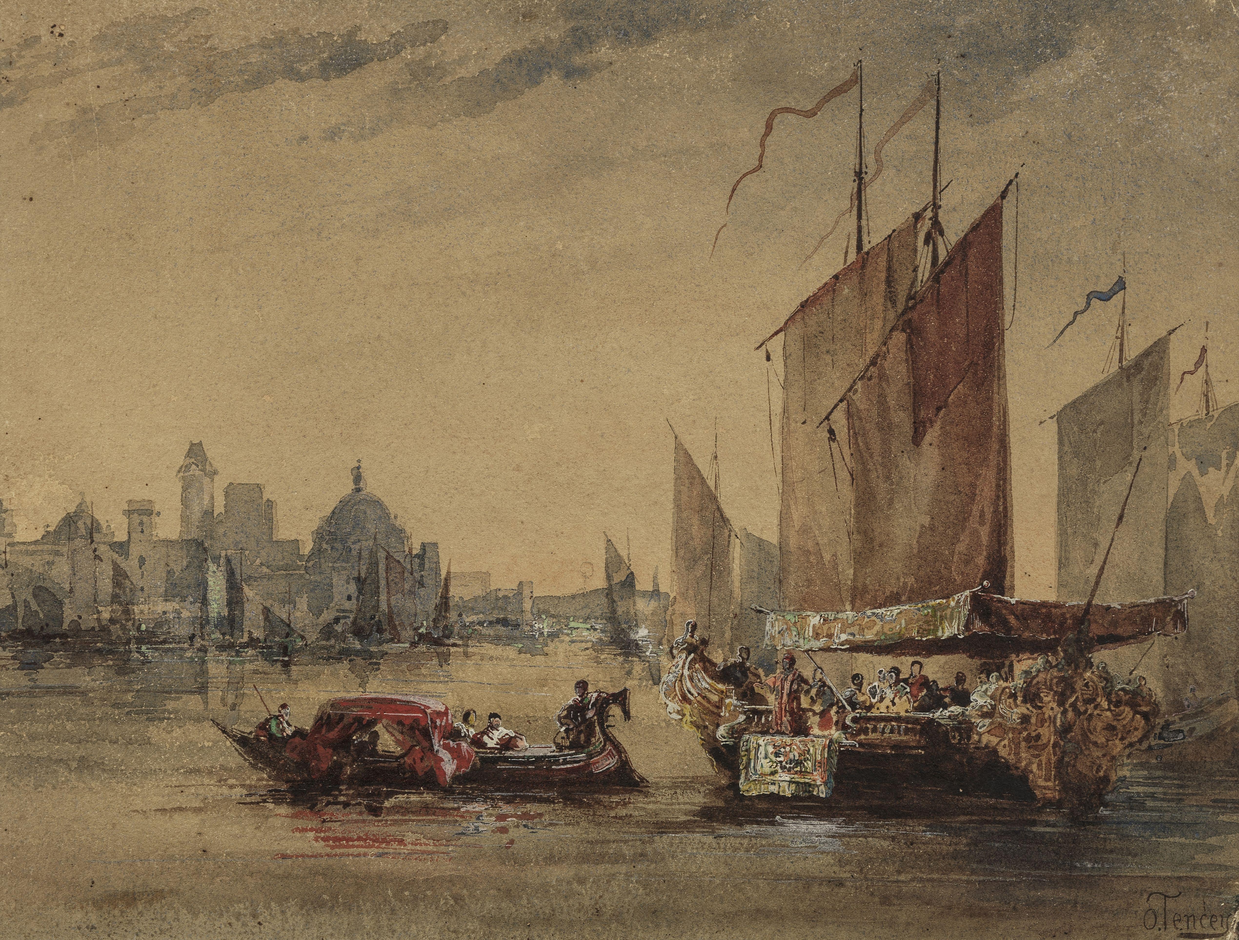 Scène orientaliste dans un port, aquarelle sur papier, signée O. Tencez, 22x29 cm