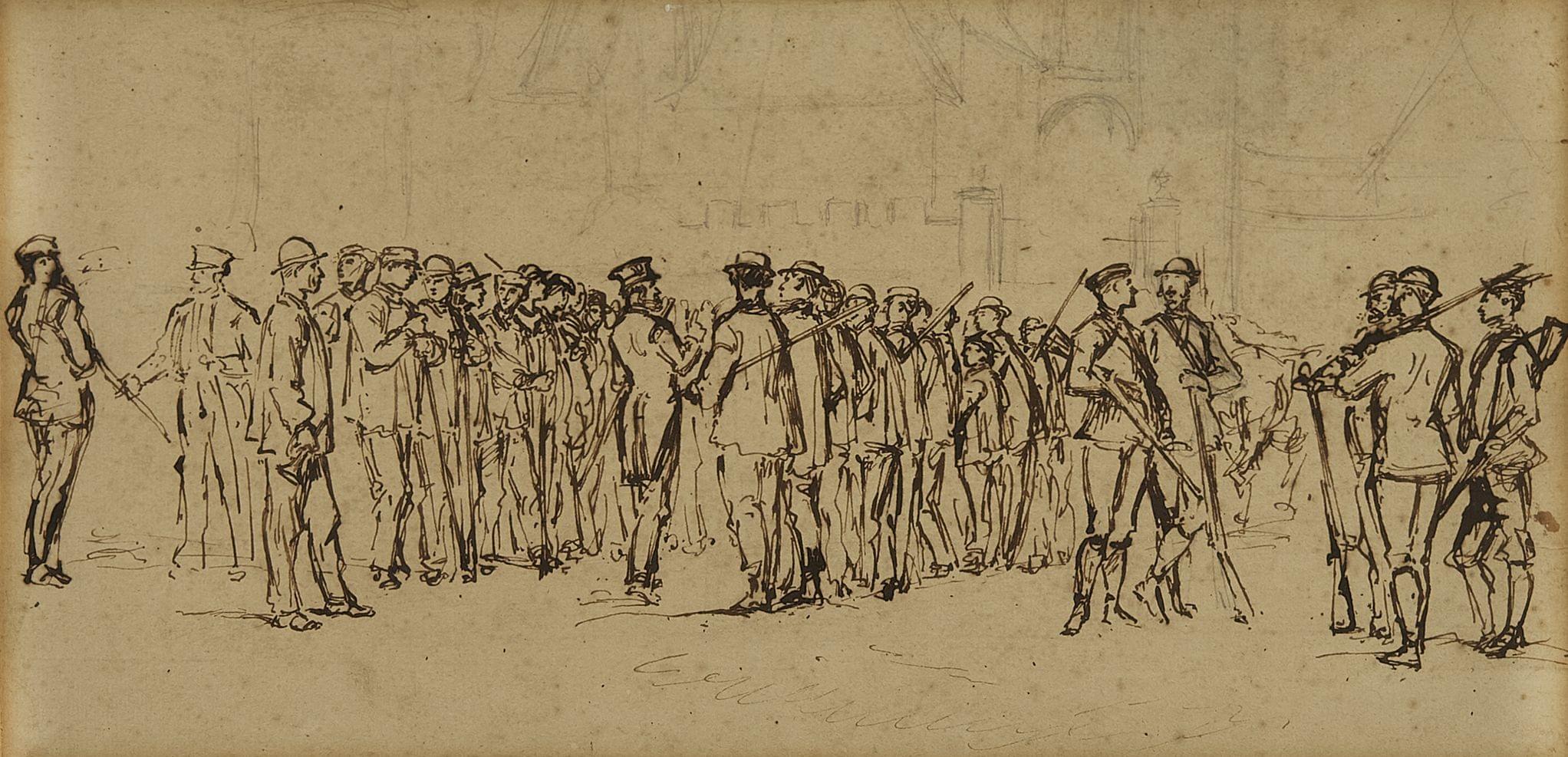 Assemblée de chasseurs au pied d'un château, plume et mine de plomb, 16x33 cm