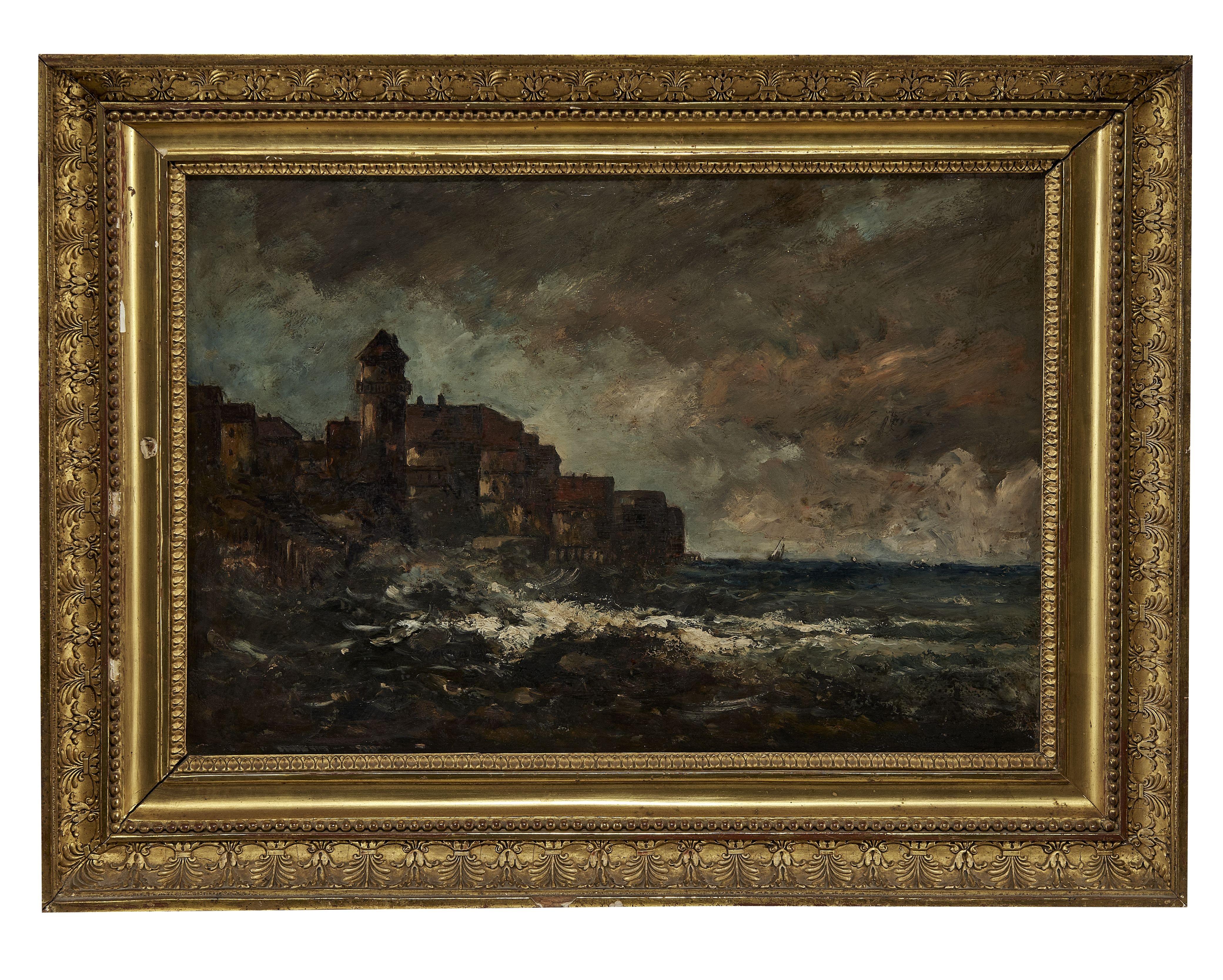 Ville au bord d'une mer agitée, huile sur panneau, 32x45 cm