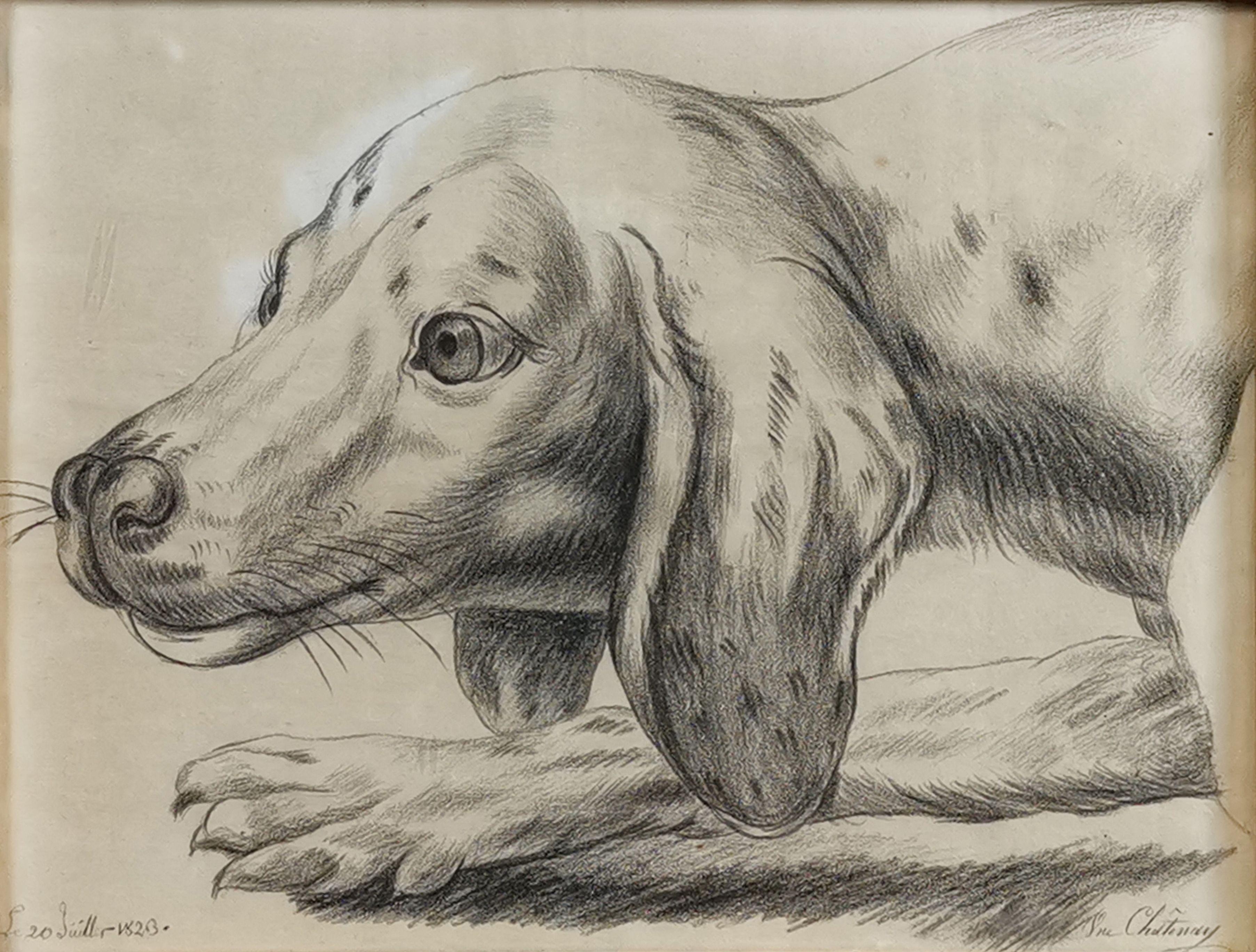 Portrait de chien, mine de plomb sur papier, datée 1823 et signée Chatenay, 23x30 cm