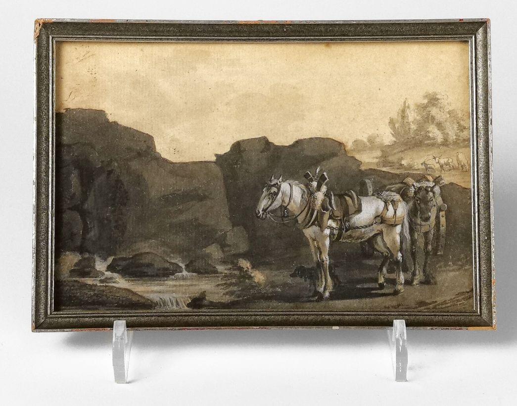 Chevaux de trait à la source, mine et gouache sur papier, 11x17 cm