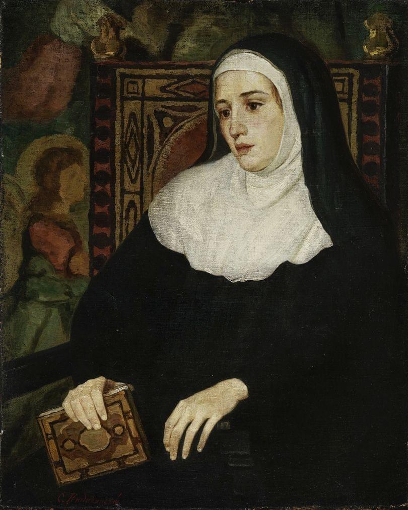 Religieuse, huile sur toile marouflée, signature non identifiée, 57x46 cm
