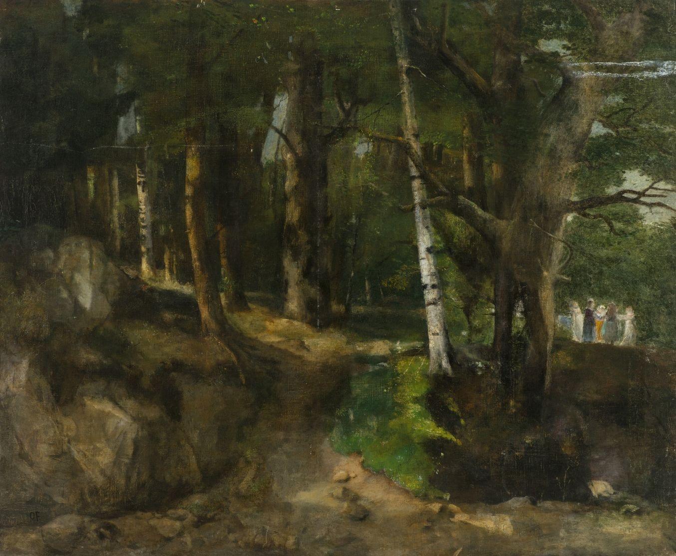 Rencontre dans les bois, huile sur toile, monogrammée OF, 78x96 cm