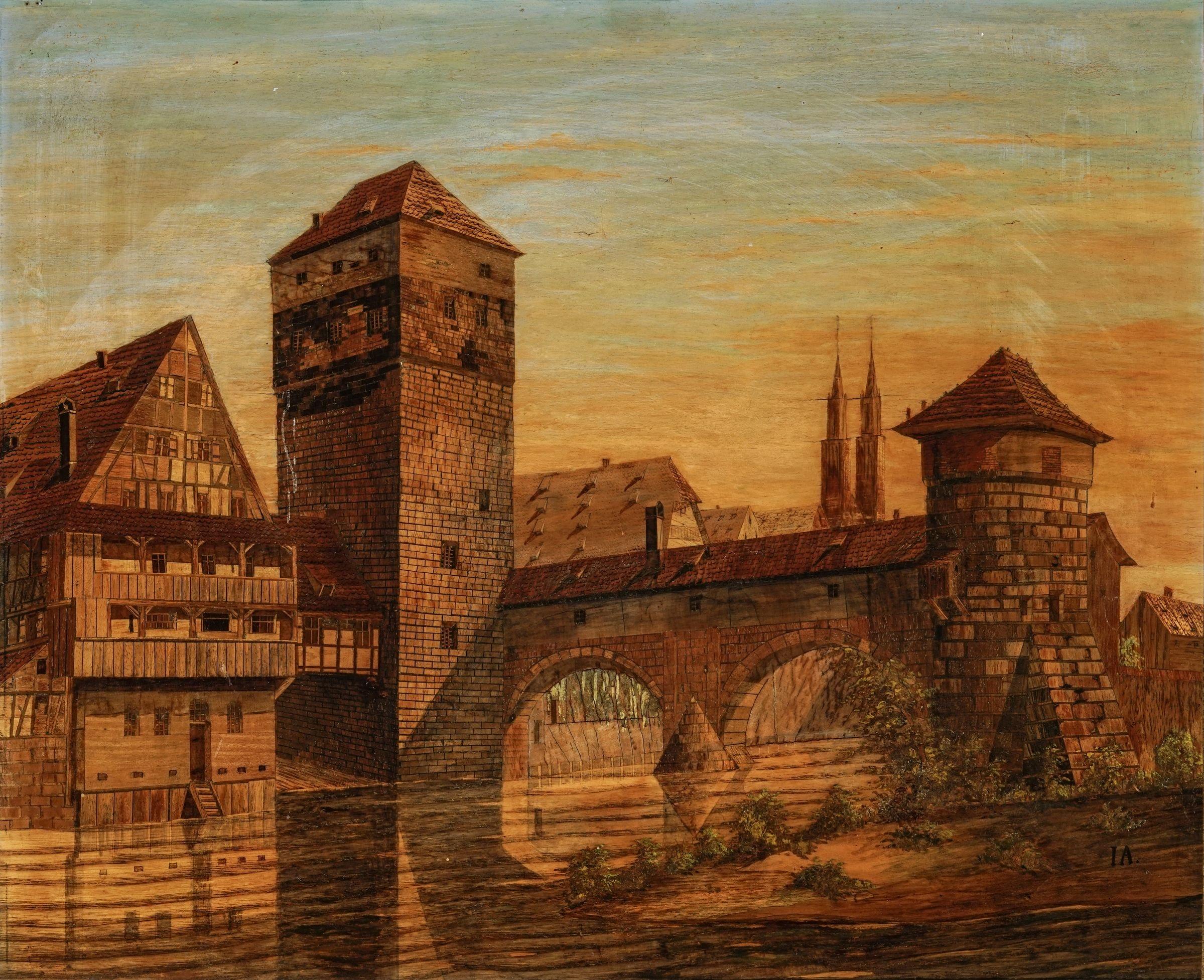 Vue de ville, marqueterie de bois et peint, 47x57 cm