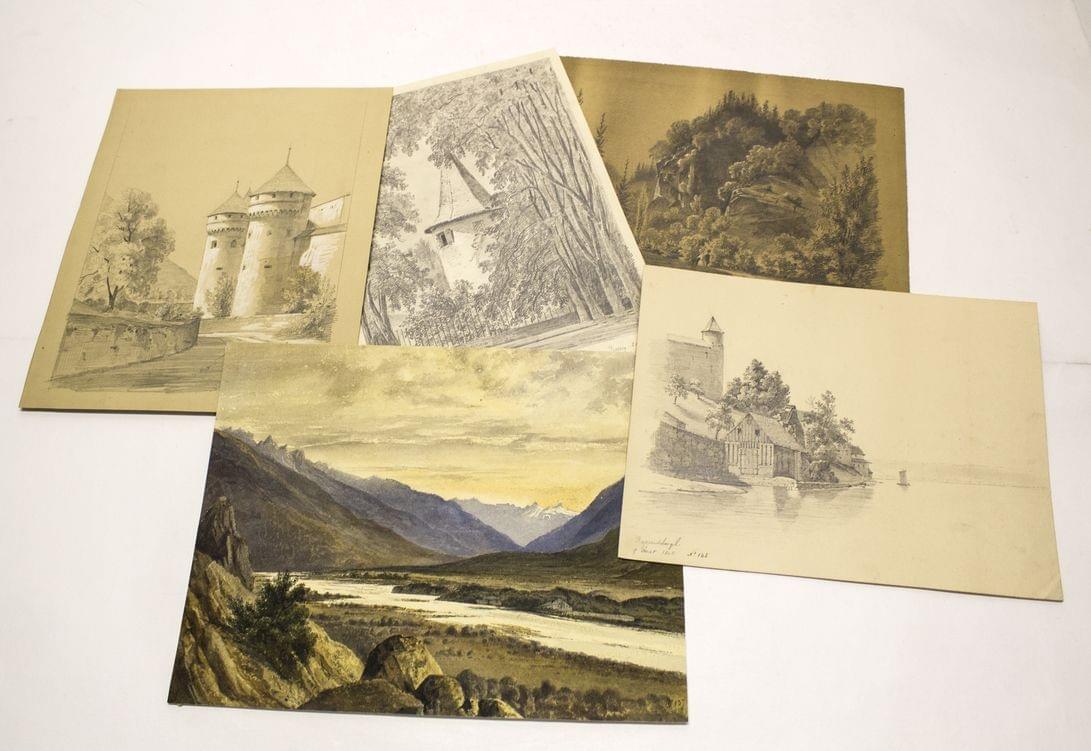 Paysages de rivières, lacustres et avec châteaux, 4 mines de plomb et une aquarelle, de 23,5x29,5 cm à 20x26,5 cm