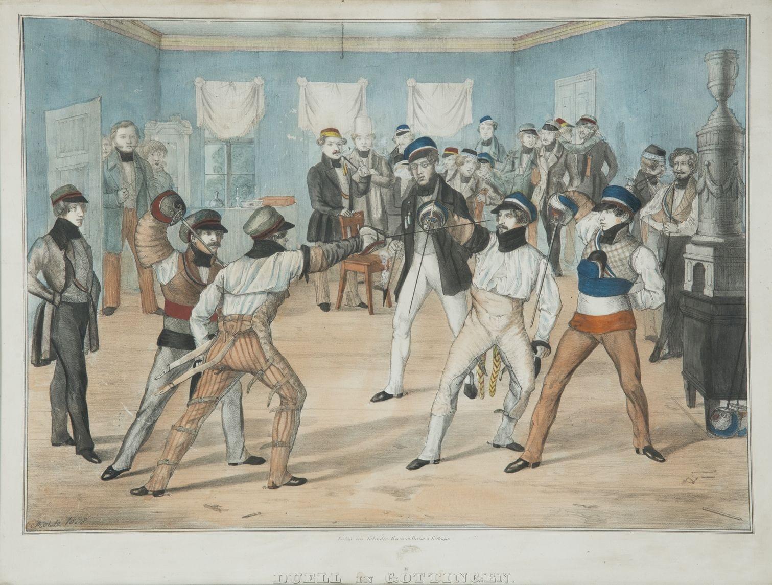 Duel de sociétaires, gravure en couleur, 38x50 cm