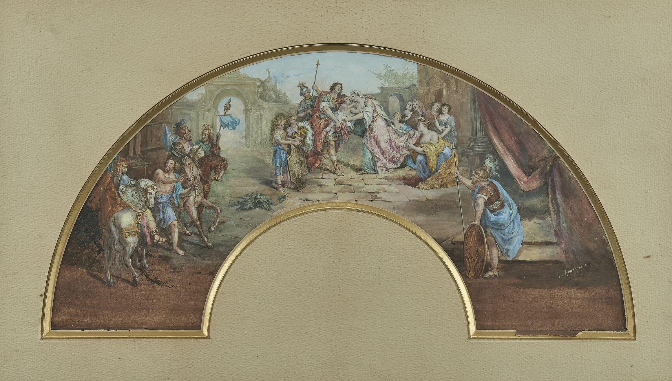 Etude pour éventail à décor d'une scène mythologique, gouache et aquarelle sur papier, signée L. Hennegrave, L 50 cm