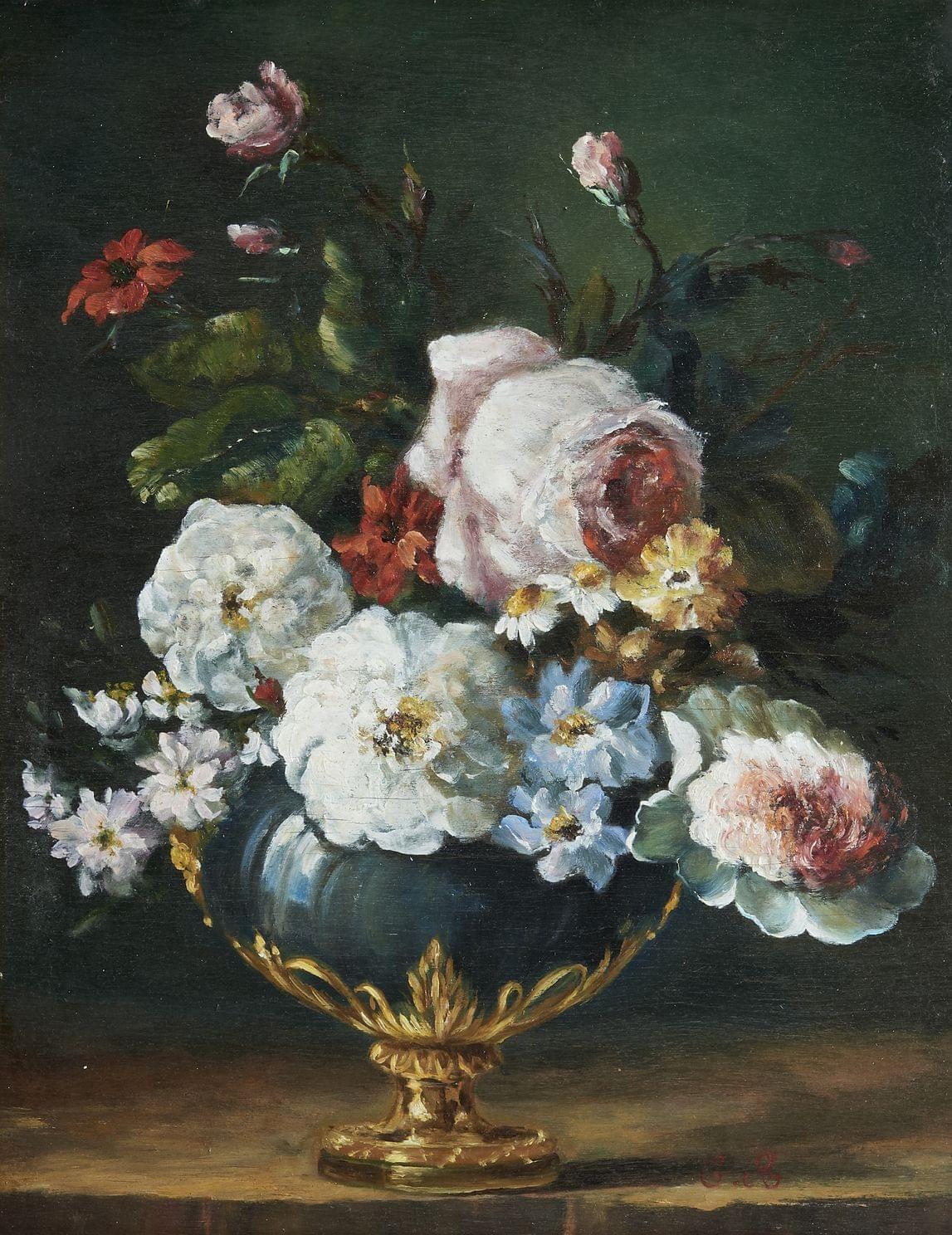 Bouquet de fleurs, huile sur panneau, monogrammée, 41x32 cm