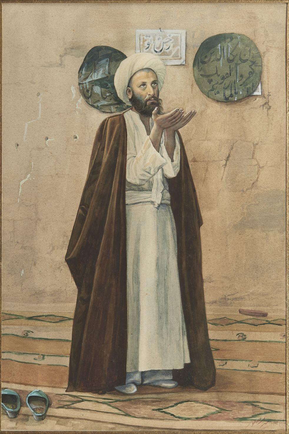 Homme en prière, aquarelle sur papier, signée, 39x26 cm