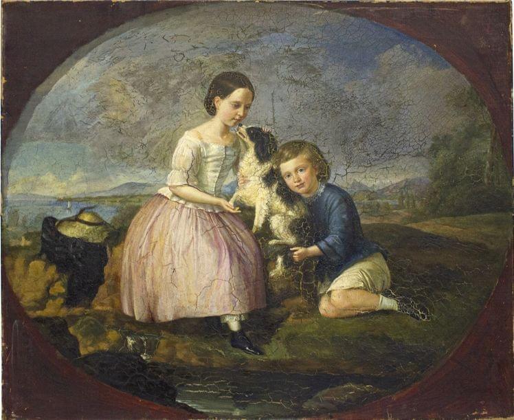 Enfants et chiens, huile sur panneau, 59,5x72,5 cm