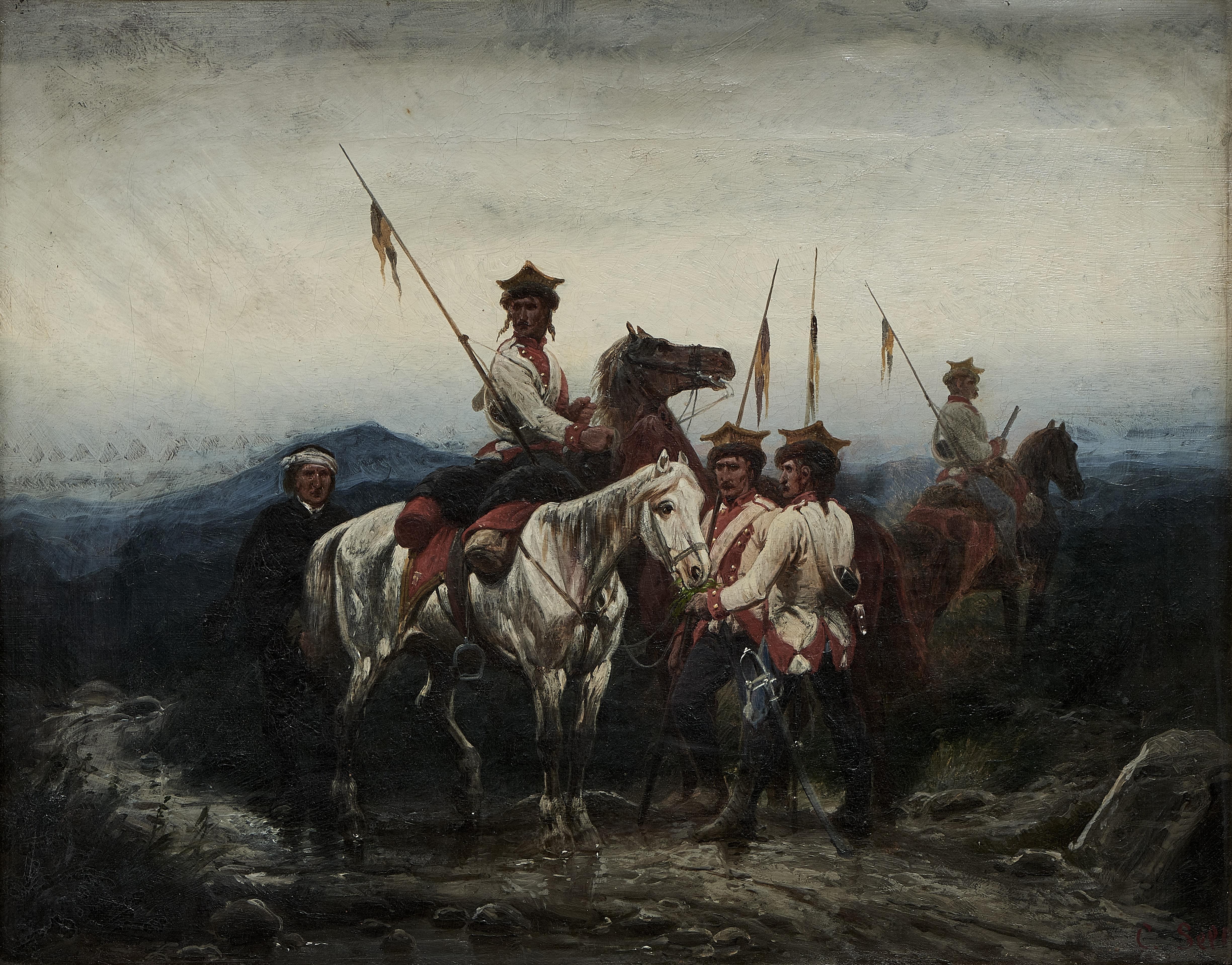 Cavaliers de l'armée napoléonienne, huile sur toile, signature non identifiée , 36x45 cm