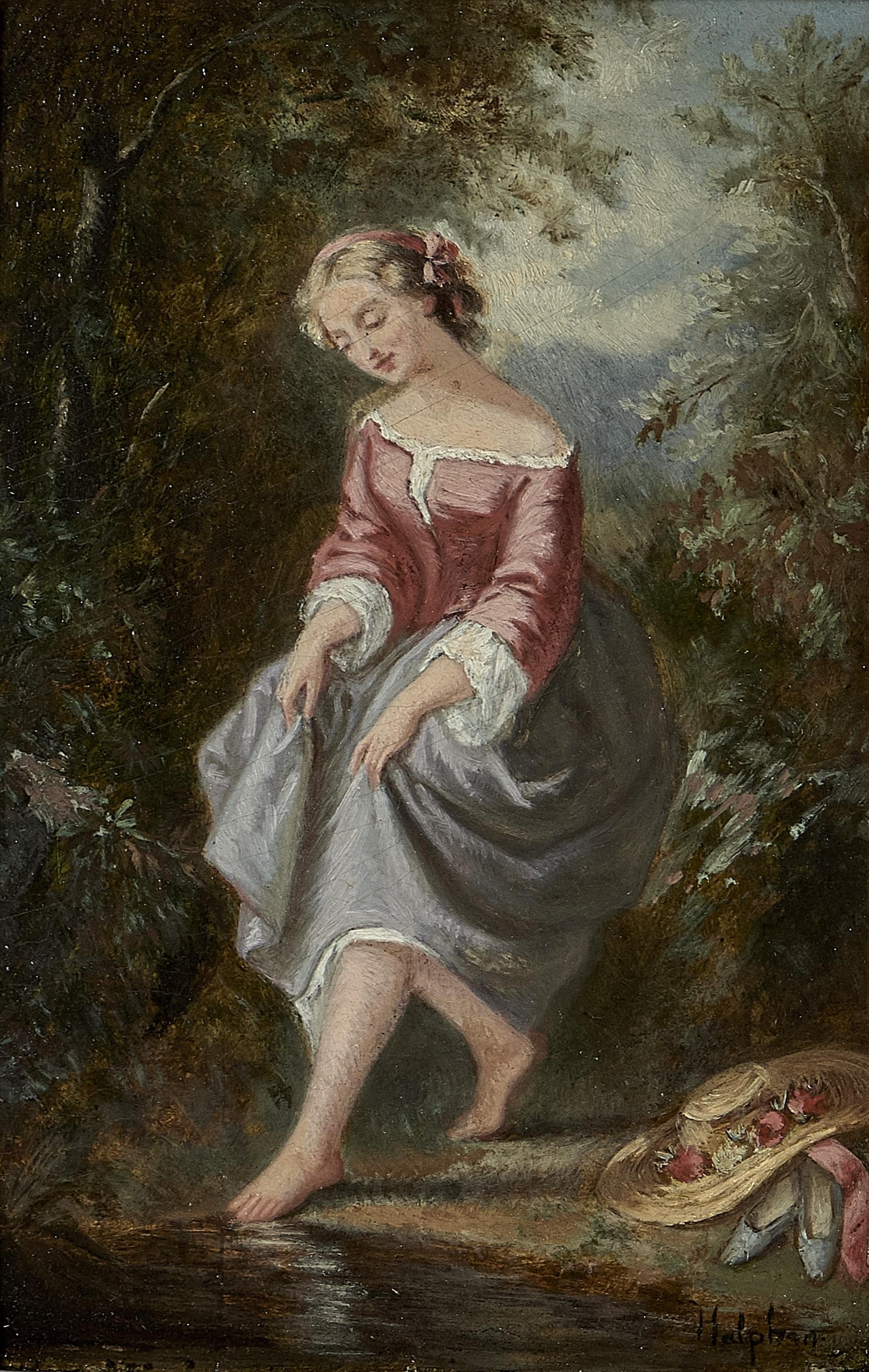 Jeune fille au bord d'une rivière, huile sur panneau, signée Halphan, 24x16 cm
