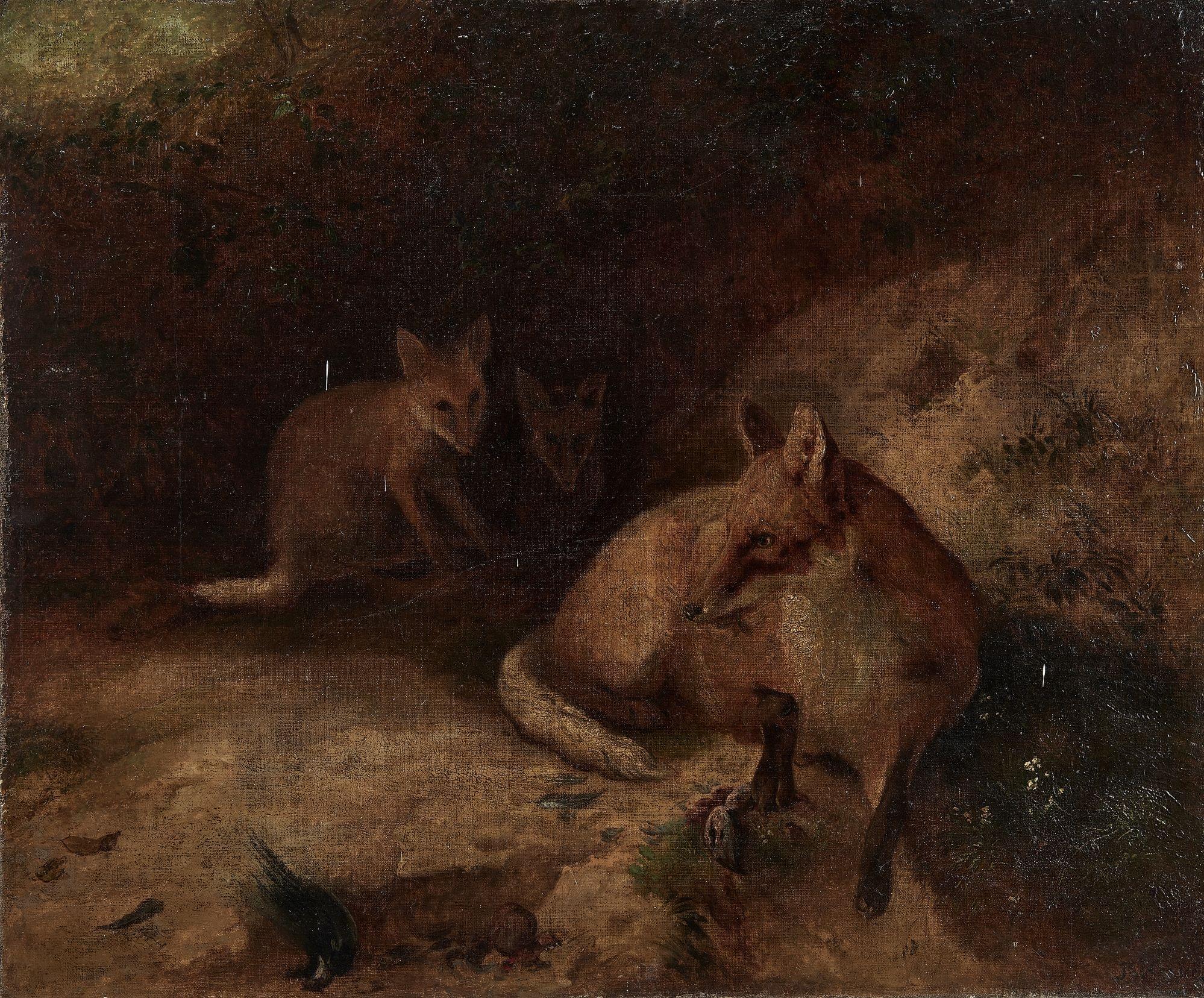 Renard et ses petits, huile sur toile, signature apocryphe de Jacques Laurent Agasse, 52x63 cm