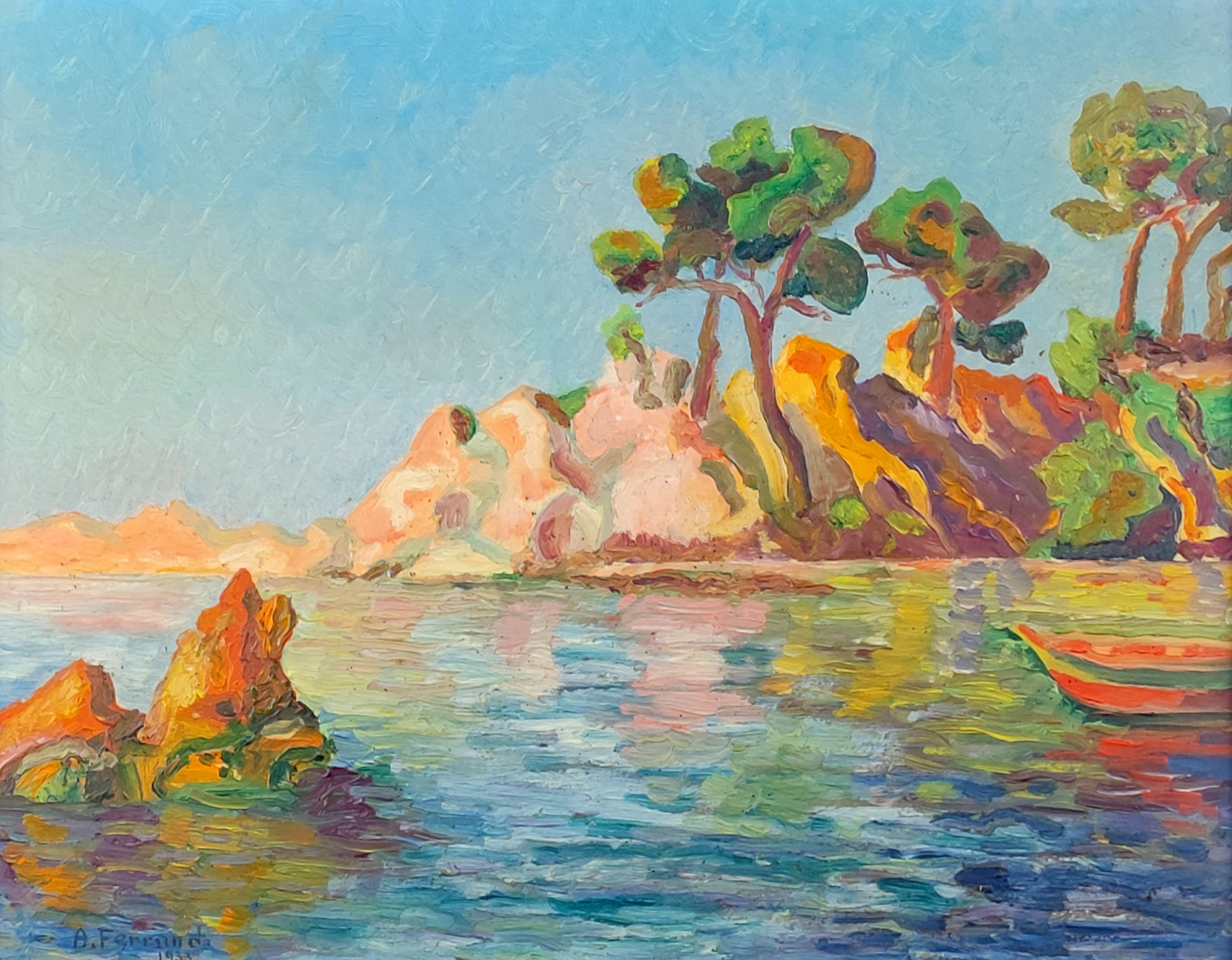 Marine, huile sur carton, signée A.Ferrand 1933, 28x36 cm
