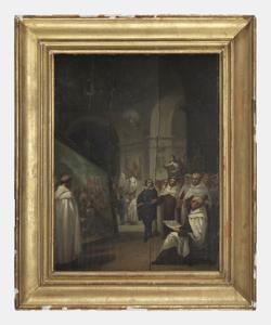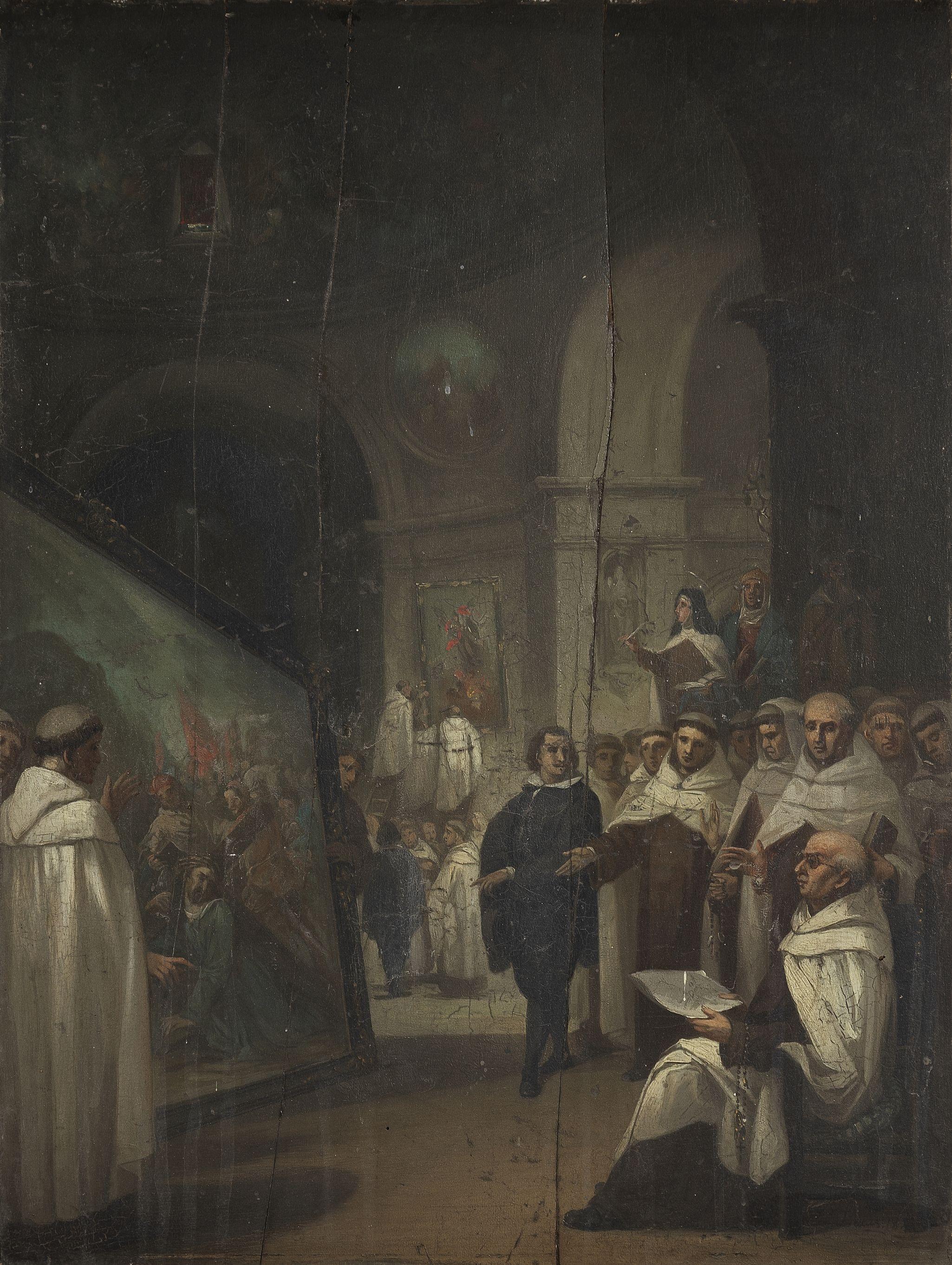 Présentation d'un tableau à des frères franciscains, huile sur panneau, signée Lucas 1882, 51x38 cm