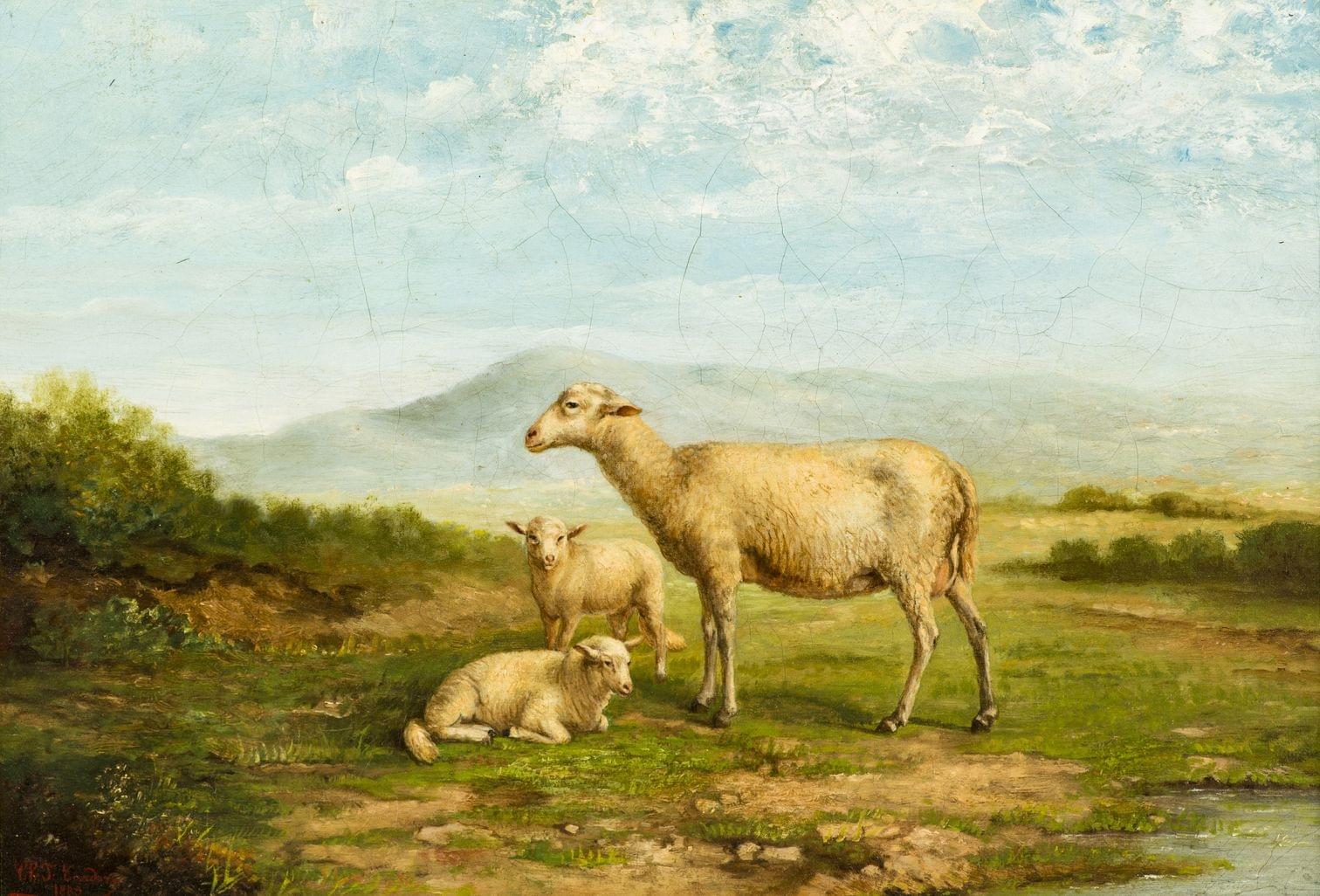 Moutons au pré, huile sur toile, 32x45 cm
