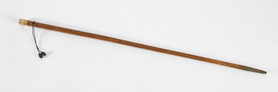 124. Canne à pommeau ciselé d'entrelacs et palmes en or rose et jaune...