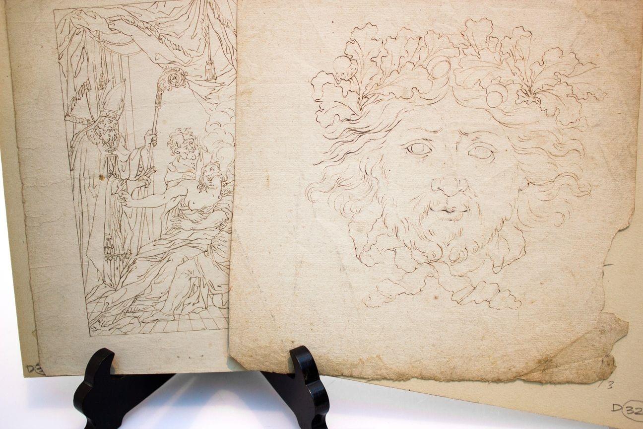 Mascaron, scènes antiques et divers, ensemble de 5 dessins