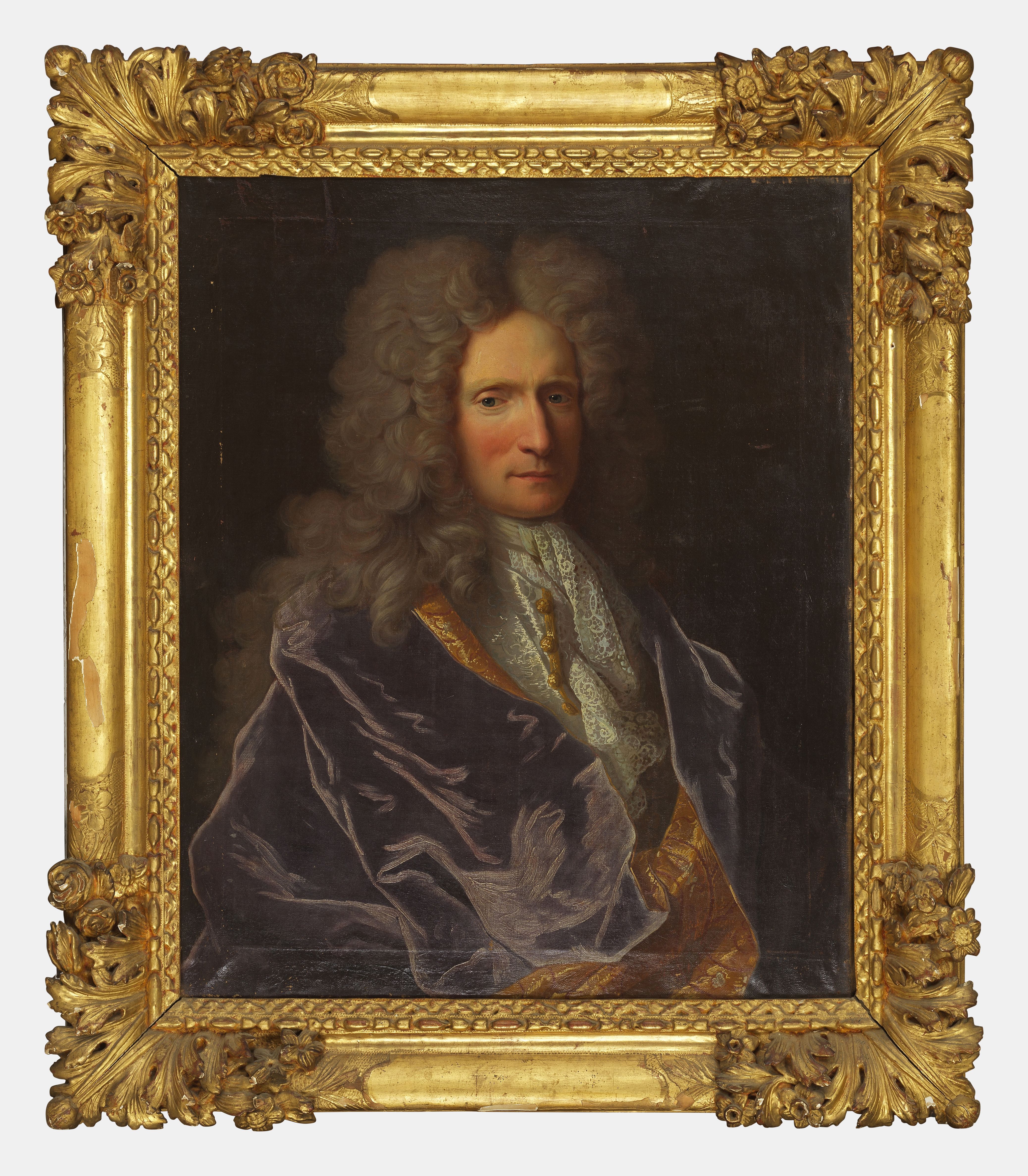 Portrait d'élégant, huile sur toile, cadre d'époque XVIIIe, bois sculpté et doré, 80x65 cm