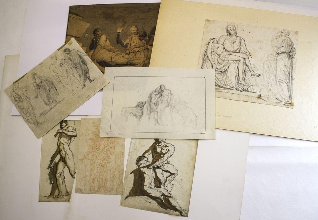 Scènes animées, études de personnages, ensemble de 7 dessins à la mine de plomb, encre et lavis, sanguine, de 16x10 à 21,5x25,5 cm