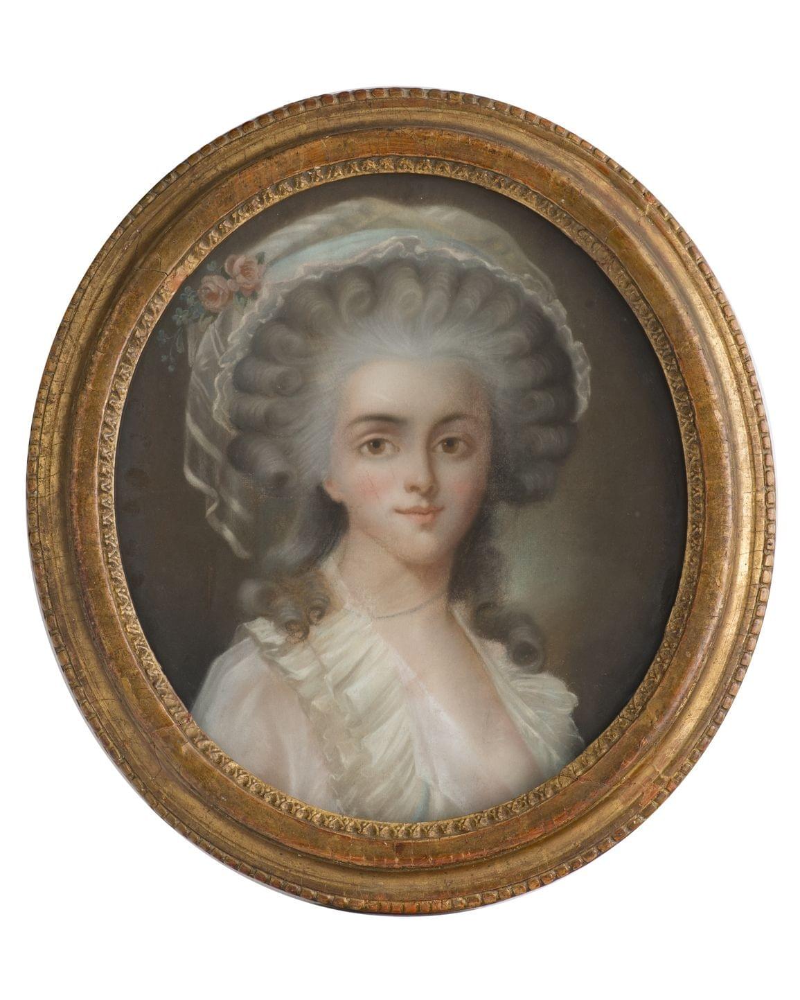 Portrait de dame à la perruque grise, pastel sur papier, ovale, 40x35 cm