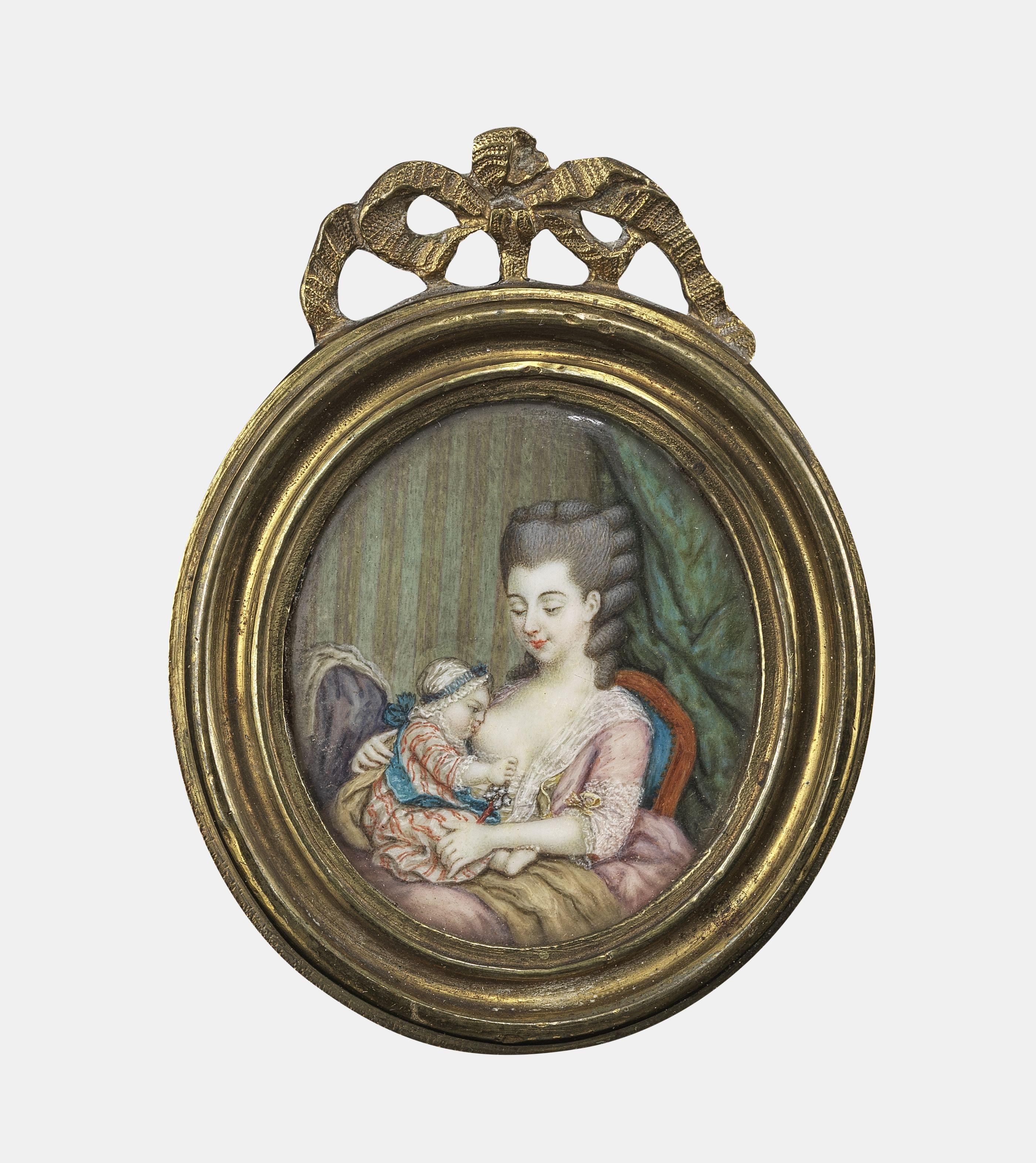 Jeune femme allaitant, miniature à la gouache, 4,5x4 cm