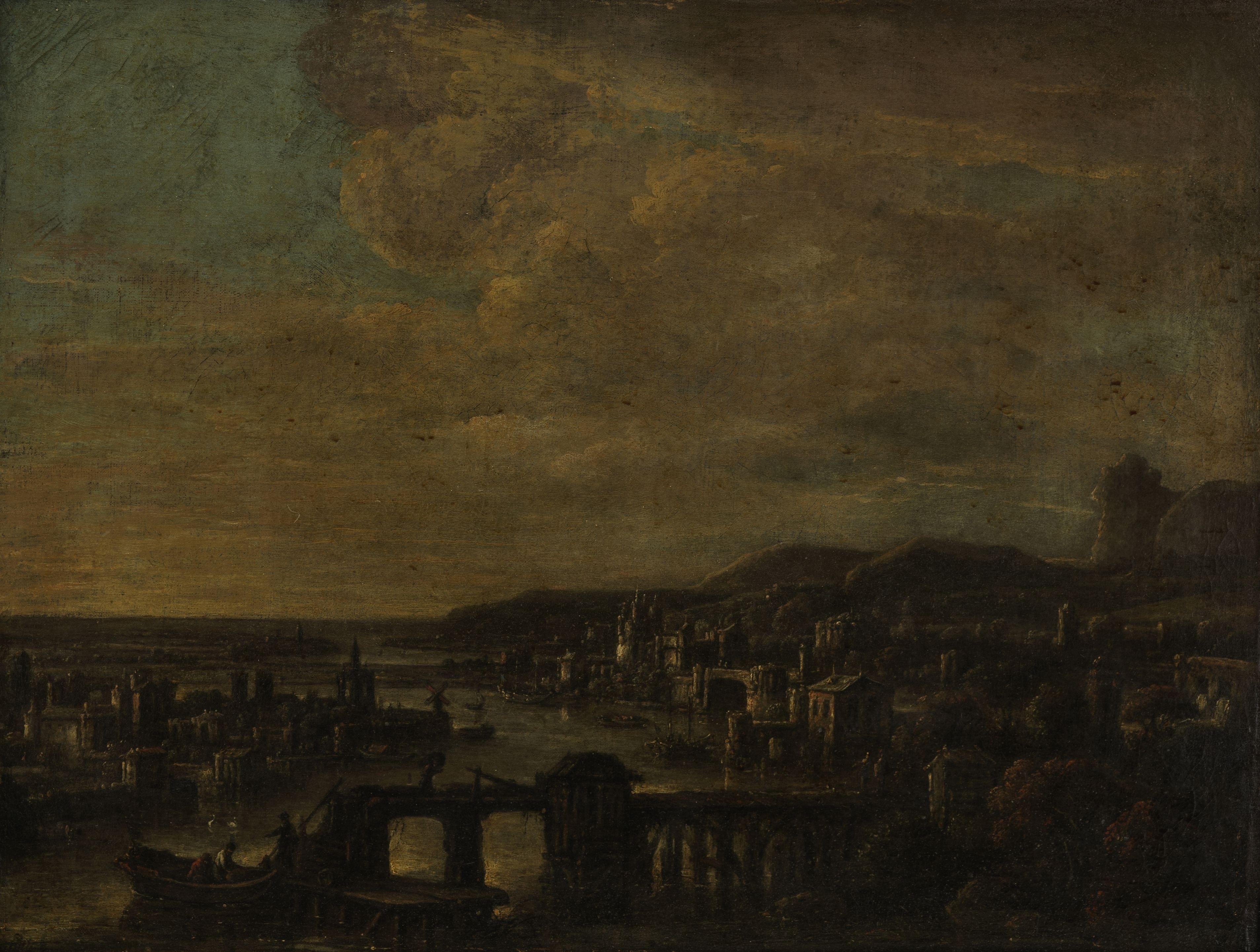 Vue d'une ville le long d'un fleuve, huile sur toile, 46x61 cm