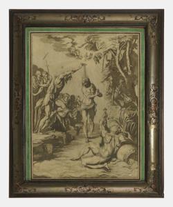 Le baptême du Christ, gravure, 41x33 cm. Cadre XVIIIe s en marqueterie Boulle d'écaille et étain sur fond de cuivre.
