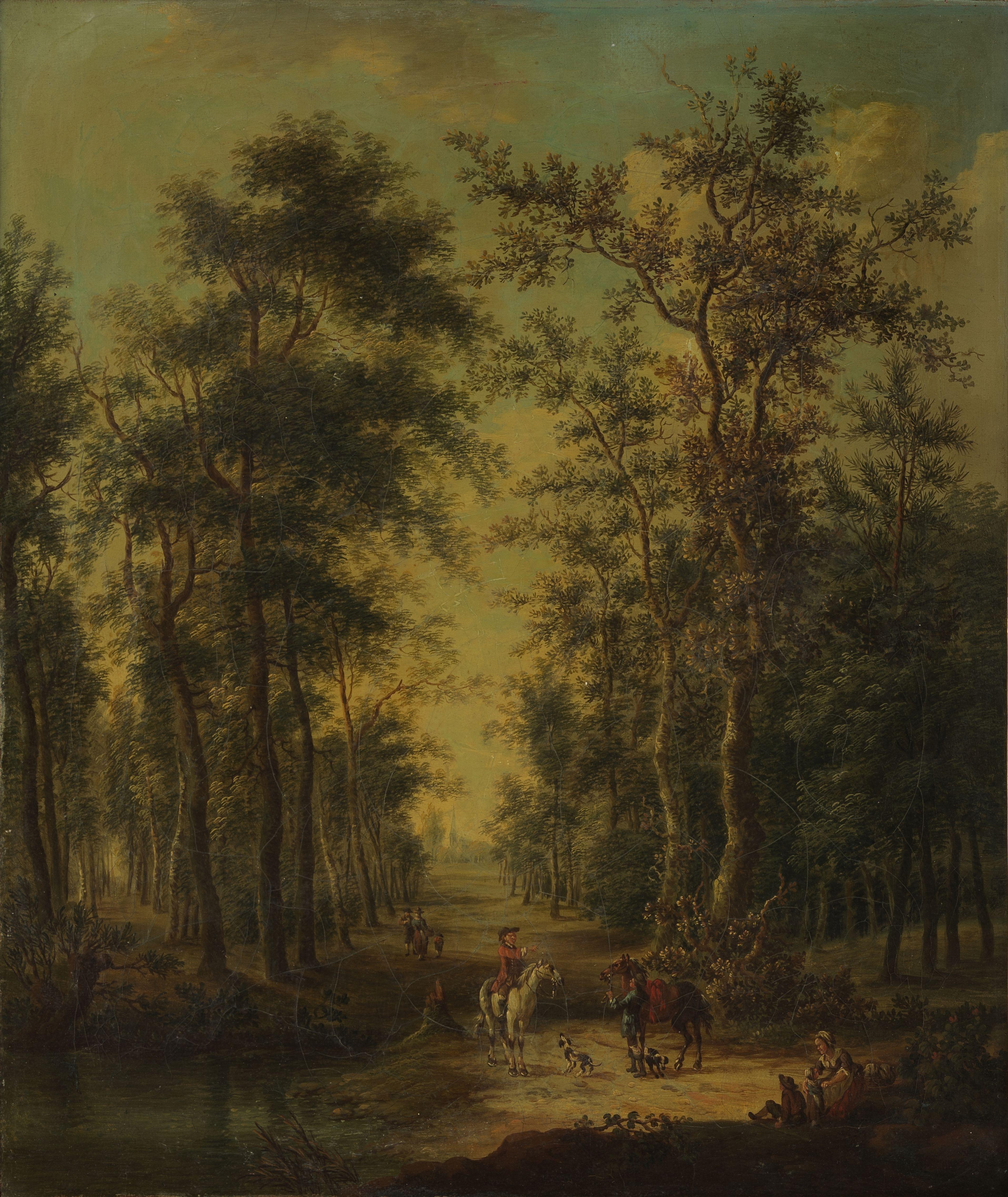 Chemin bordé d'arbres avec chevaliers, huile sur toile, 48x42 cm