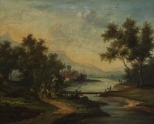 Deux paysages fluviaux animés, paire d'huiles sur toile, 48x58 cm