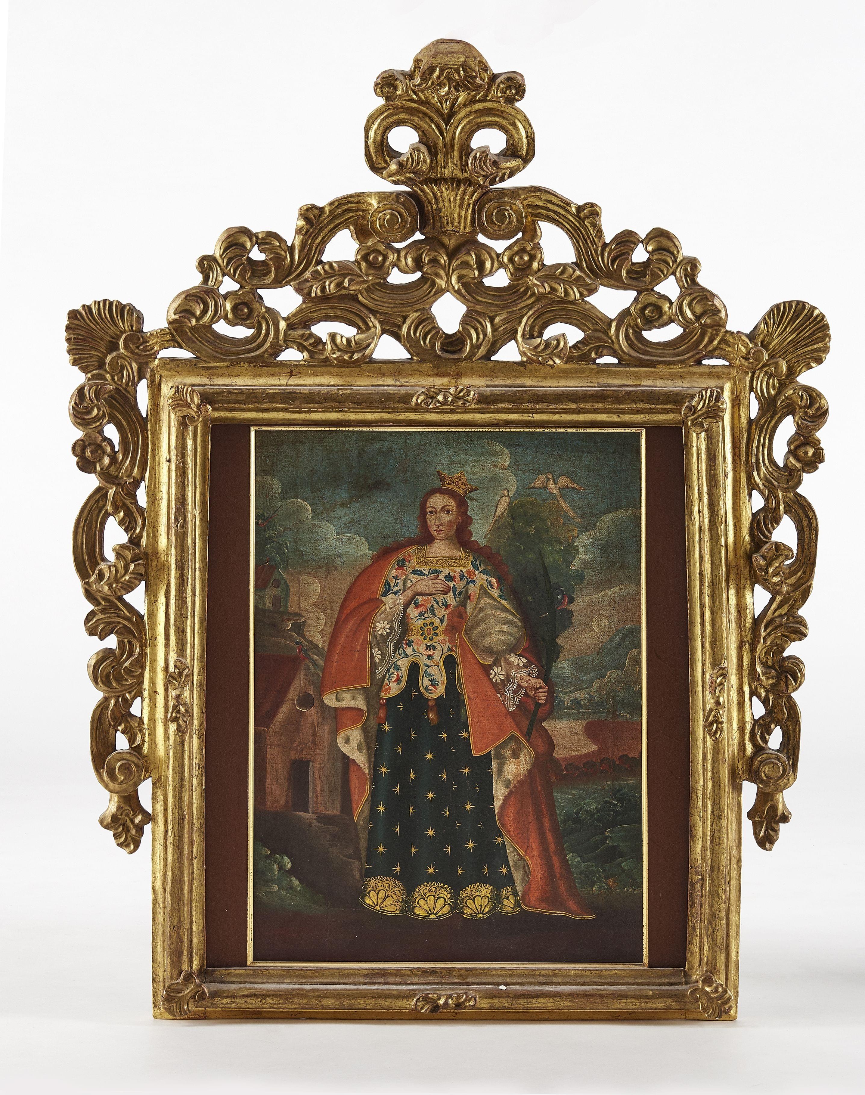 Reine martyre, huile sur toile. Cadre en bois sculpté, ajouré et doré, 63x44 cm.