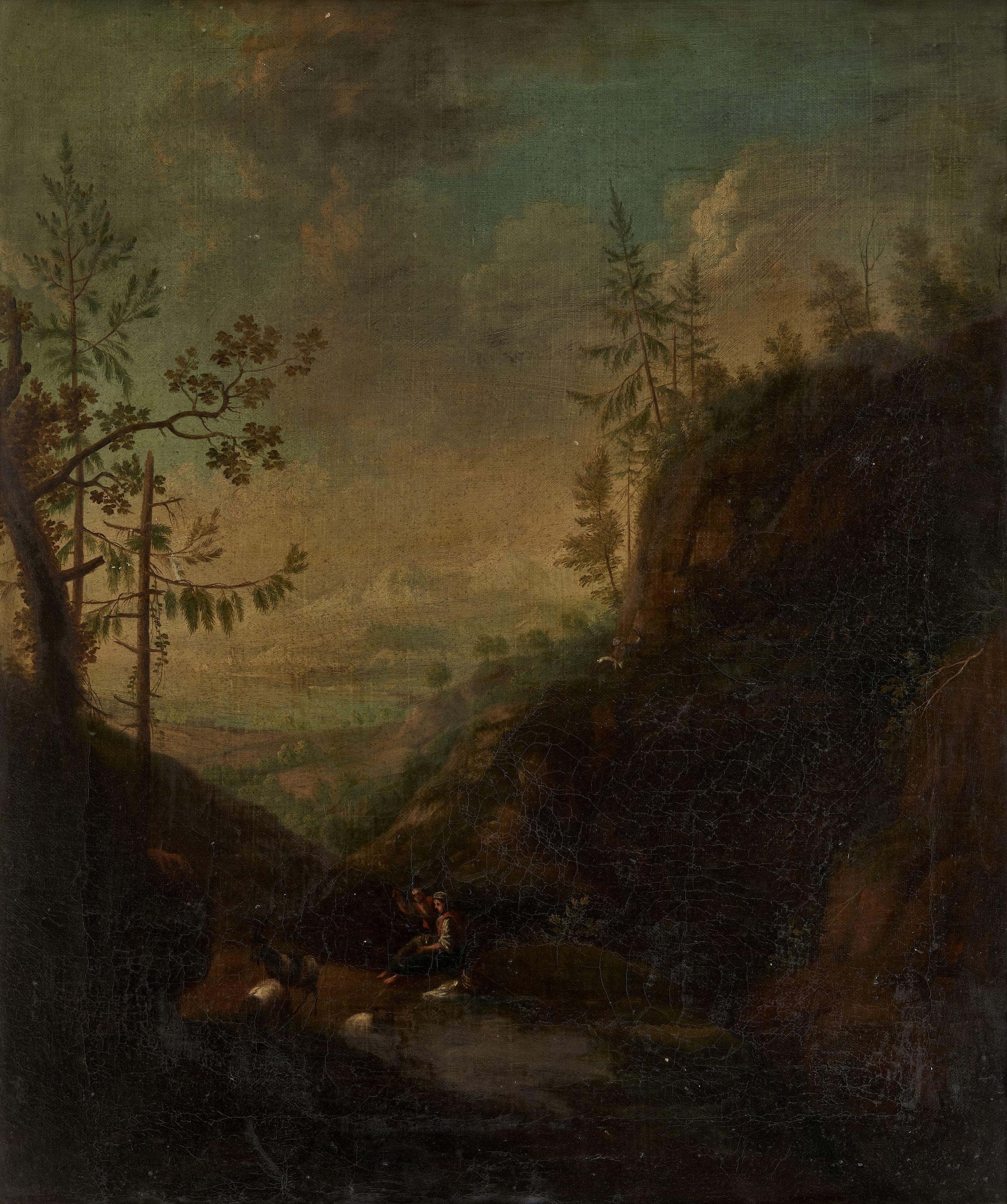 Berger, bergère et leurs chèvres dans la montagne, huile sur toile, 64x55 cm