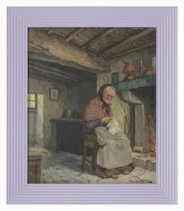 Grand-mère brodant près de la cheminée, huile sur panneau, signature illisible, 56x46 cm