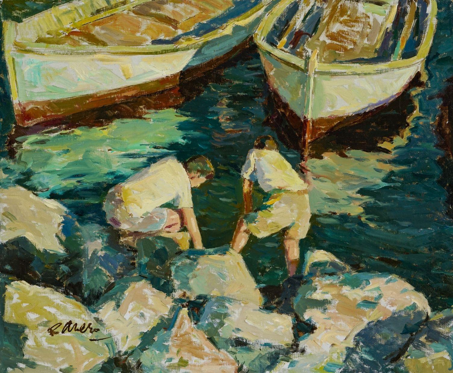 Garçons au port, huile sur toile, signature non identifiée, 46x54 cm