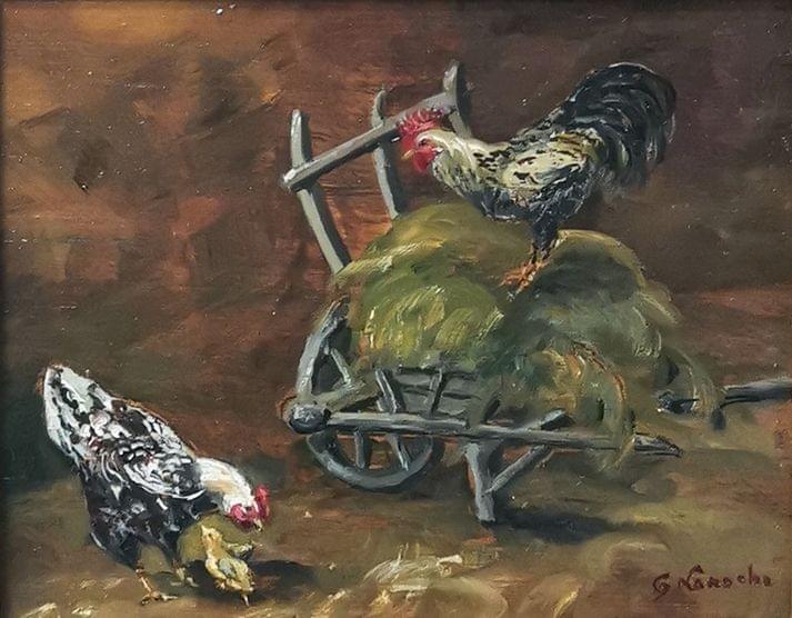 Coq, huile sur panneau, signée G.Laroche, 10x12,5 cm