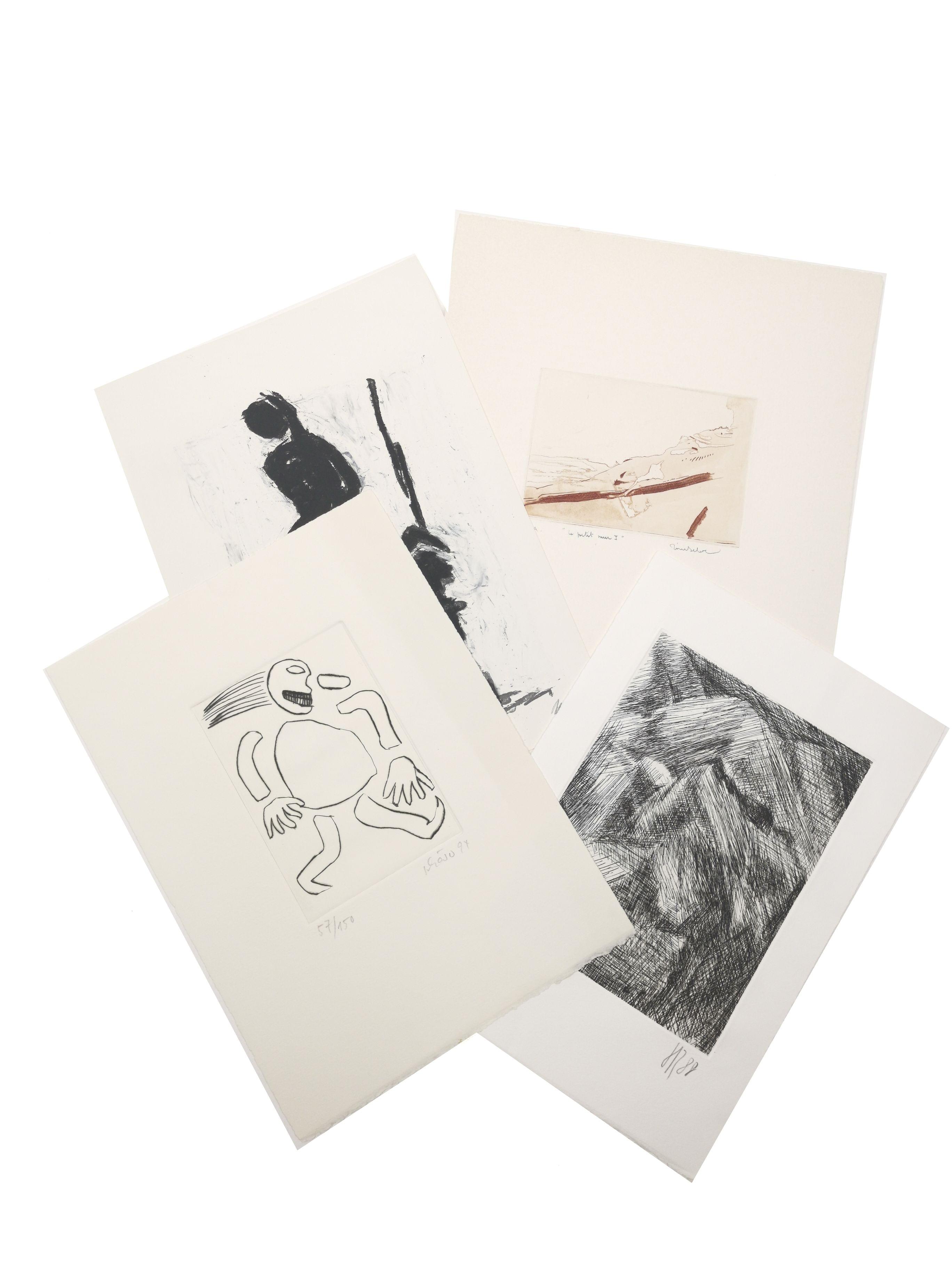 Personnages et abstractions, 4 gravures, Henri Fresset et signatures illisibles, circa 1980, 33x25 à 30x21 cm