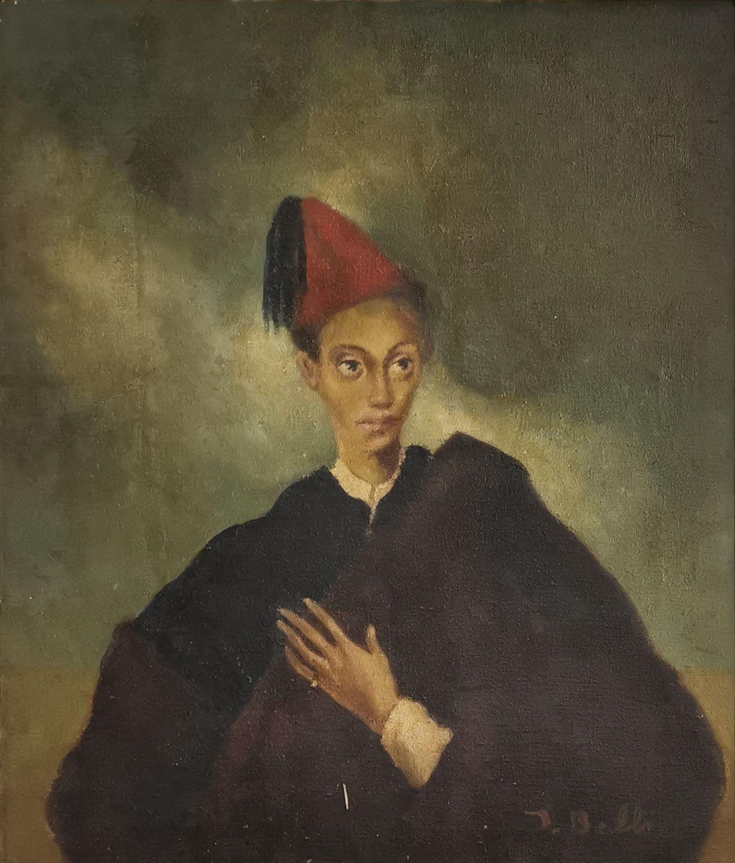 Portrait d'un jeune homme au chapeau rouge, huile sur toile, signature illisible, 45x39 cm
