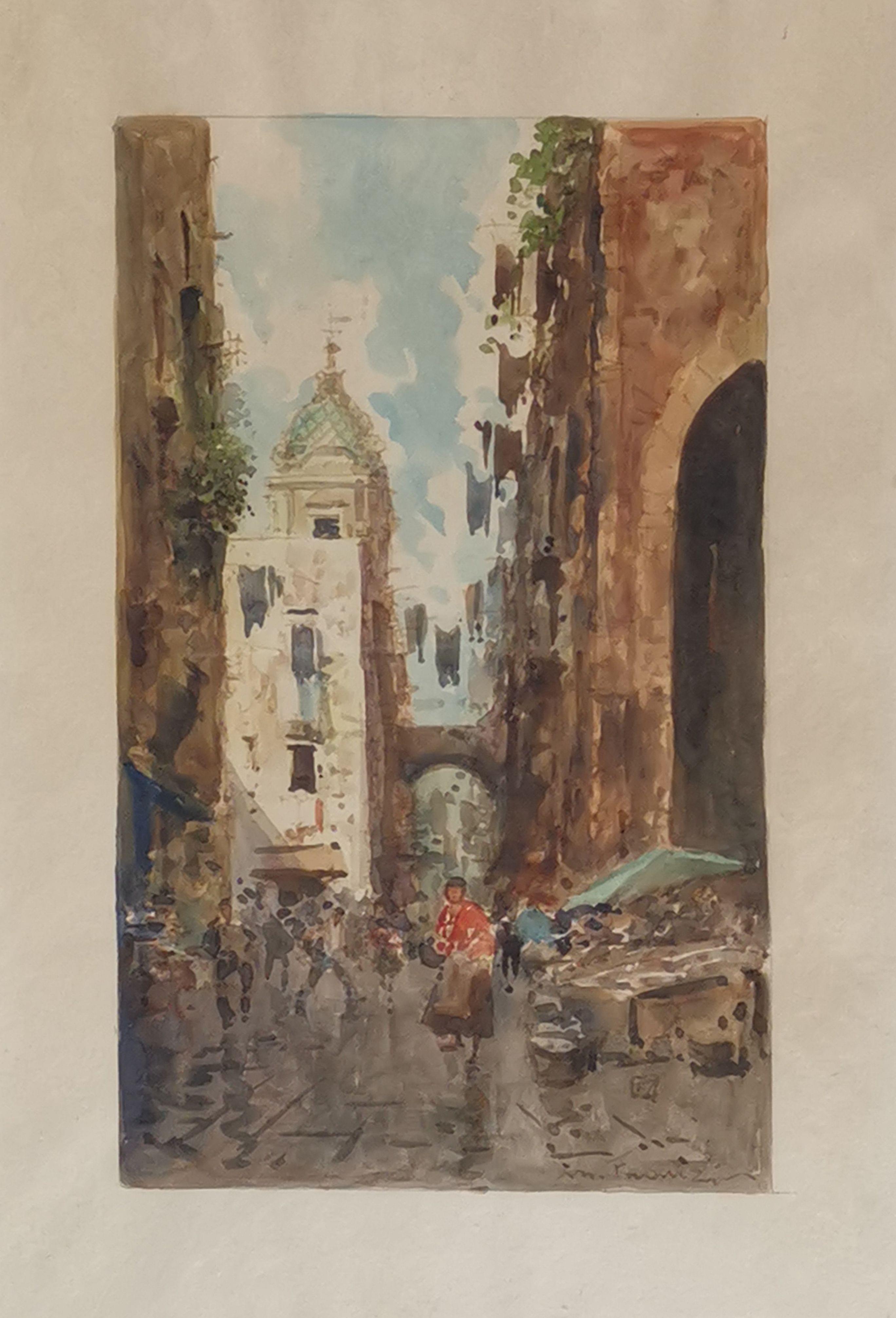 Ruelle de Naples, aquarelle sur papier, signée M.Franzi, 35x20 cm