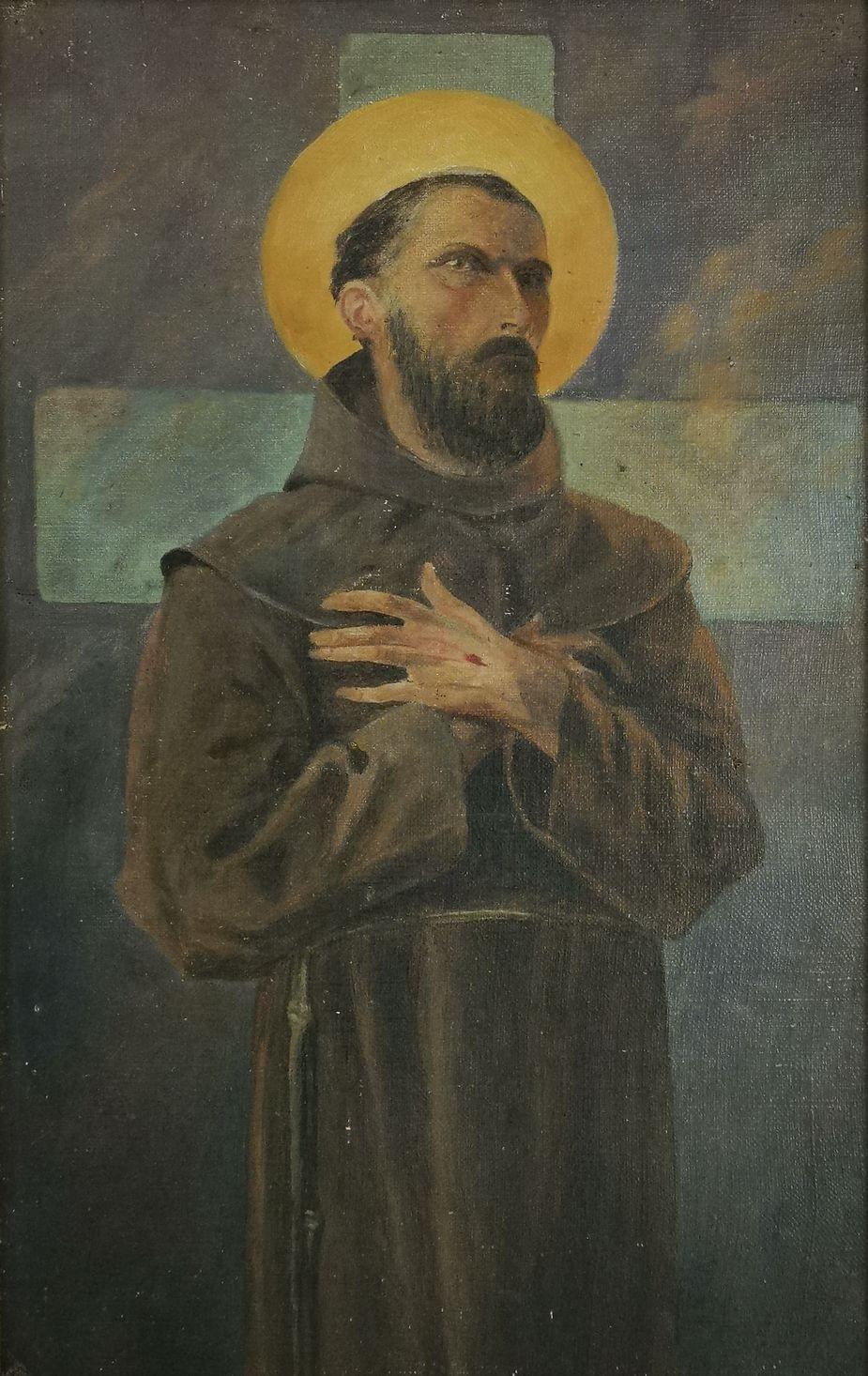 Saint personnage, huile sur toile marouflée sur pavatex, signature illisible, 40x25 cm