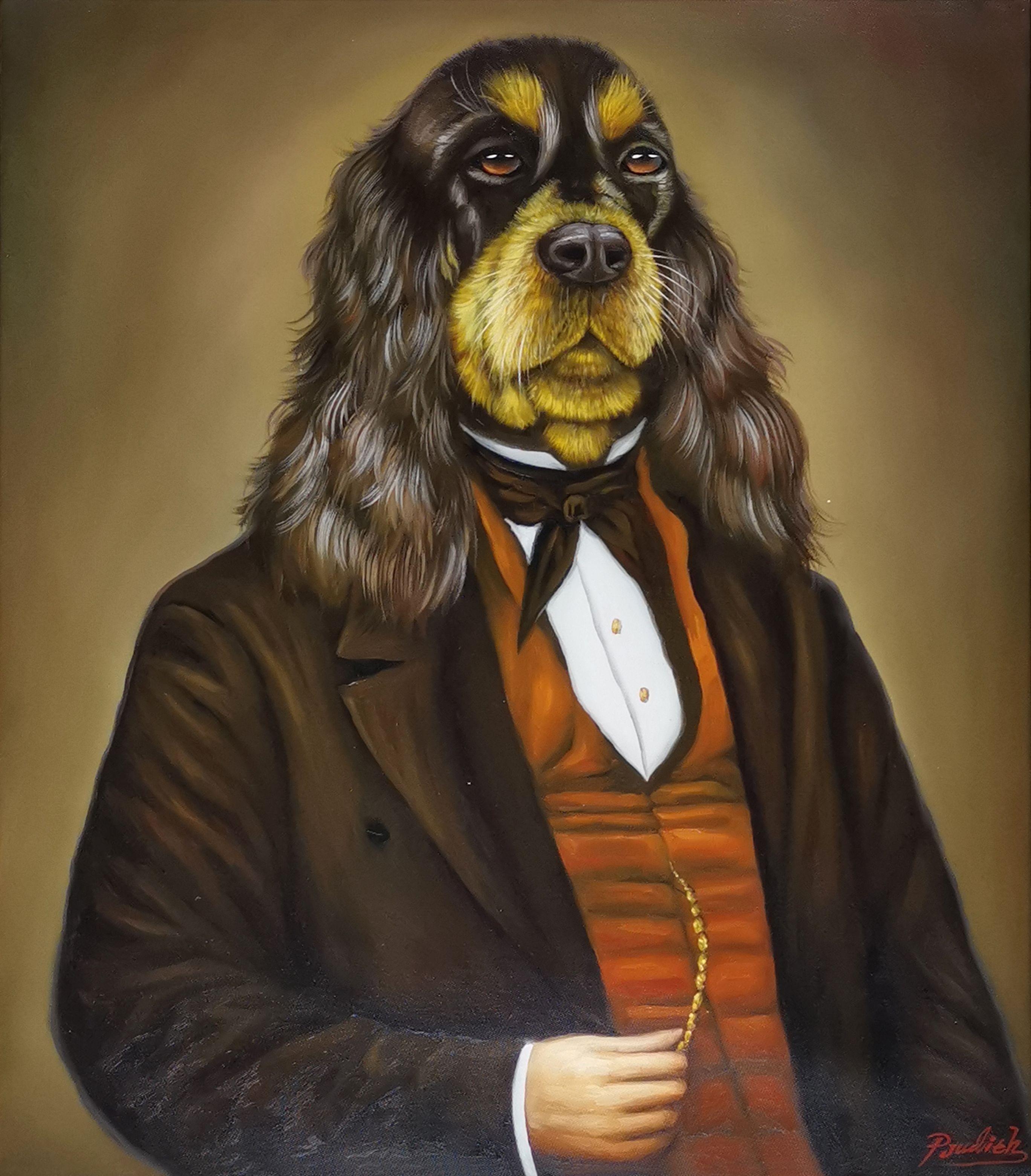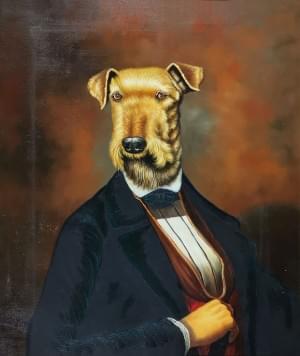 Paire de portraits cynocéphales, huiles sur toile, signées, 61x50 cm