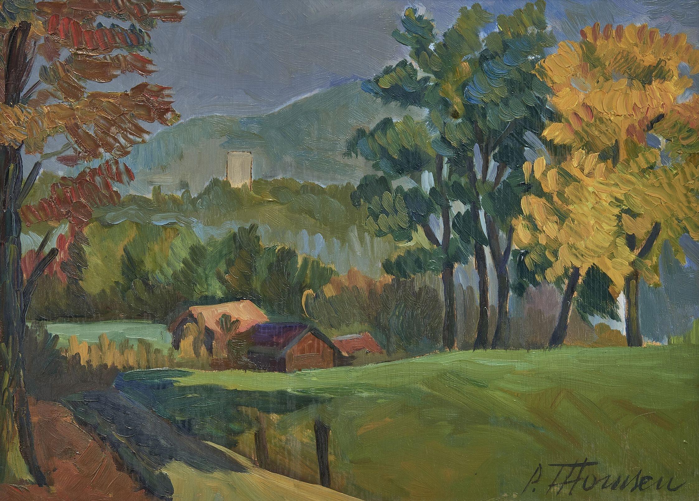 Paysage automnal, huile sur panneau signée P. Thomson, 33,5x46 cm