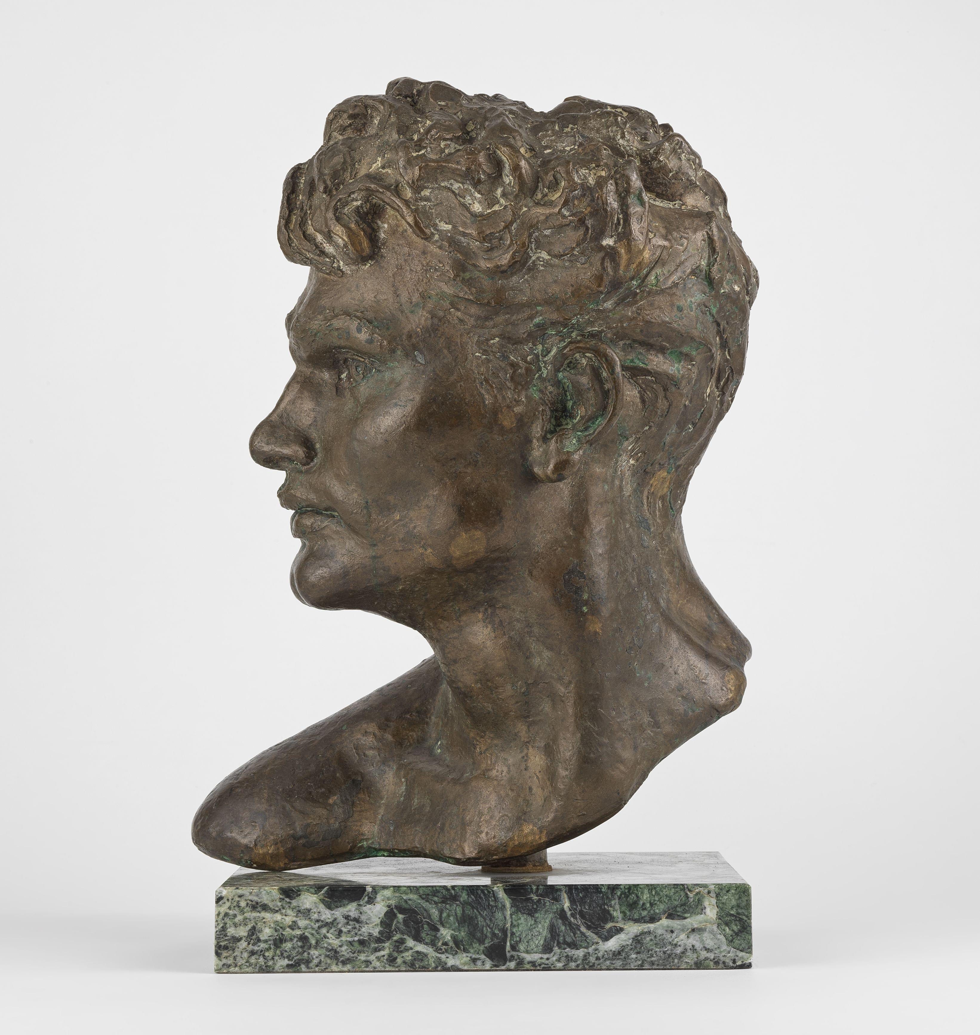 Buste de jeune homme, bronze à la cire perdue à patine foncée, signé, Rosemonde, cachet du fondeur Pastori Genève, H 40 cm
