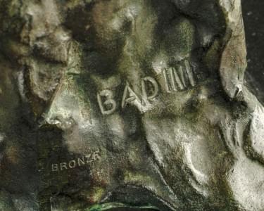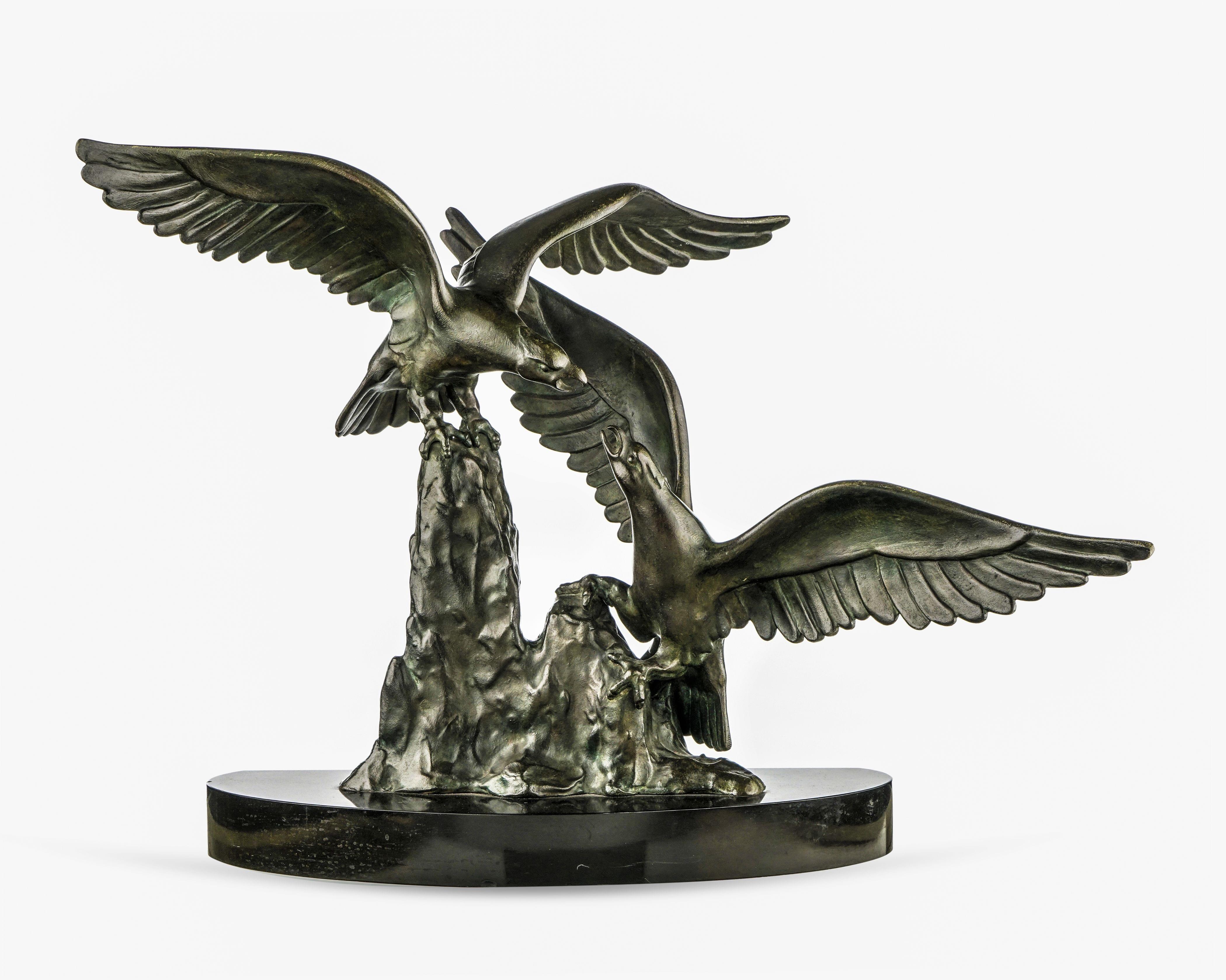 Combat d'aigles, bronze à patine noire et marbre, signé Baldini, H 45 cm