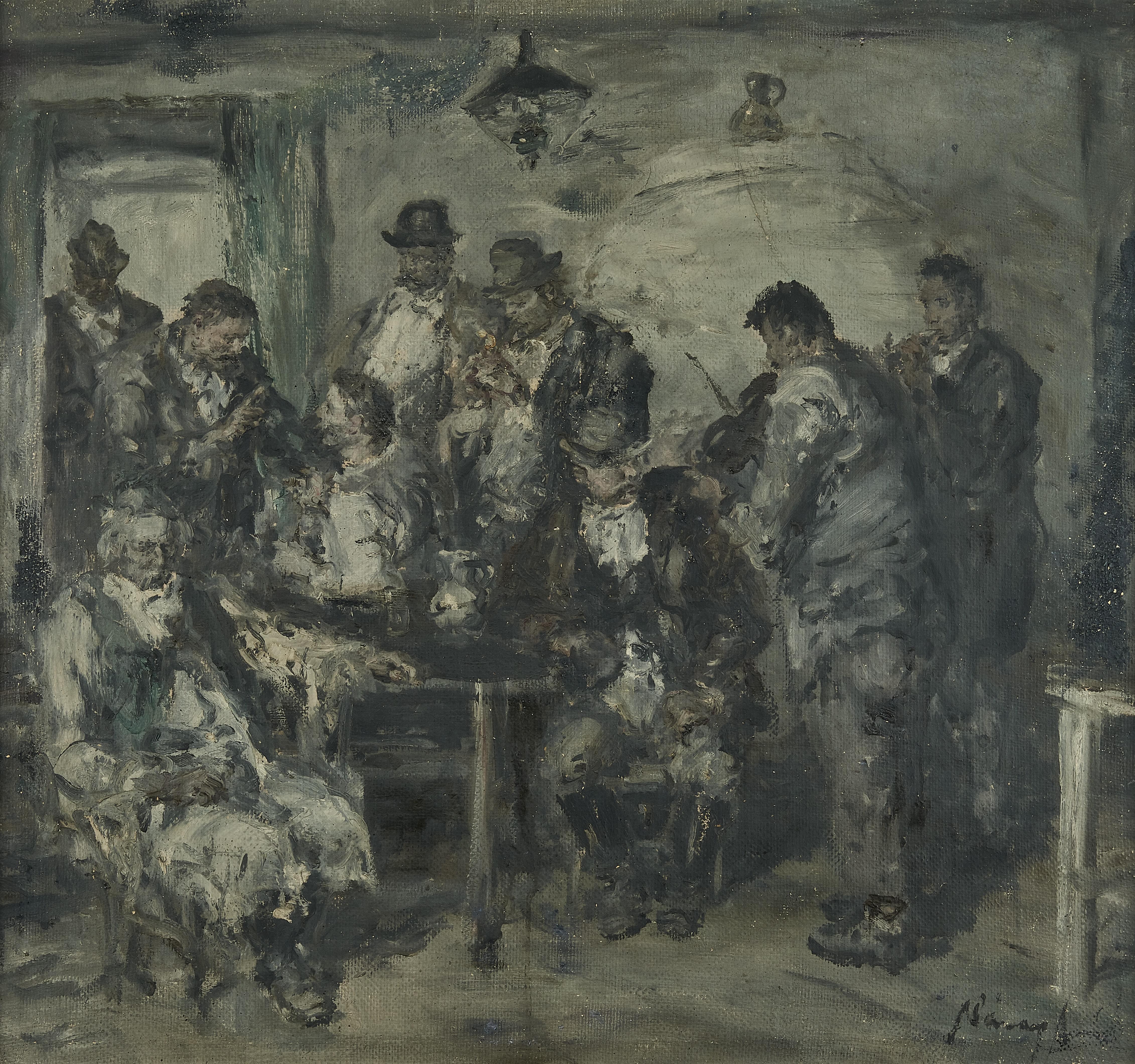 Scène de taverne, huile sur toile, signature illisible 78x84 cm