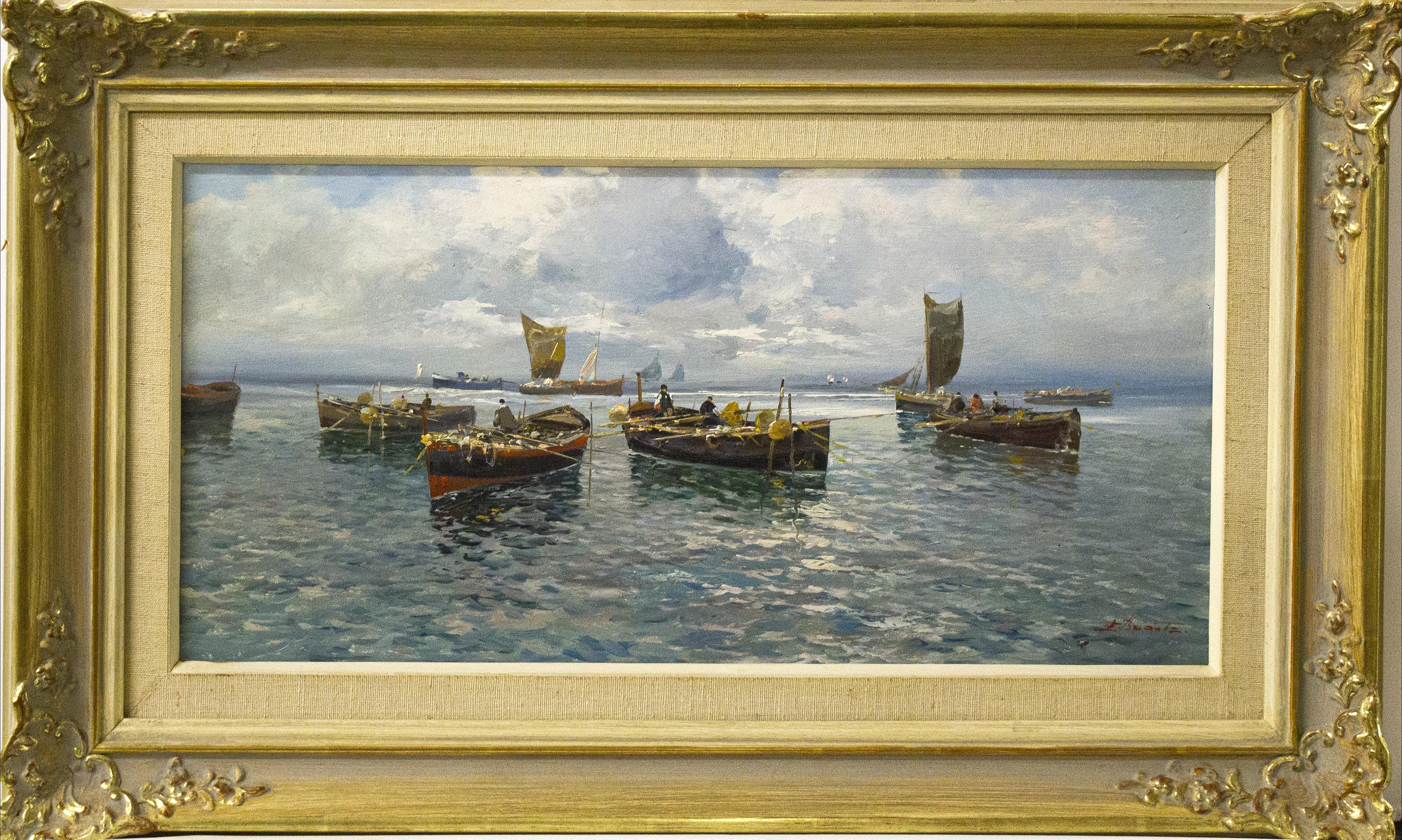 Marine, huile sur carton, signée E.Brianta, 24x49 cm