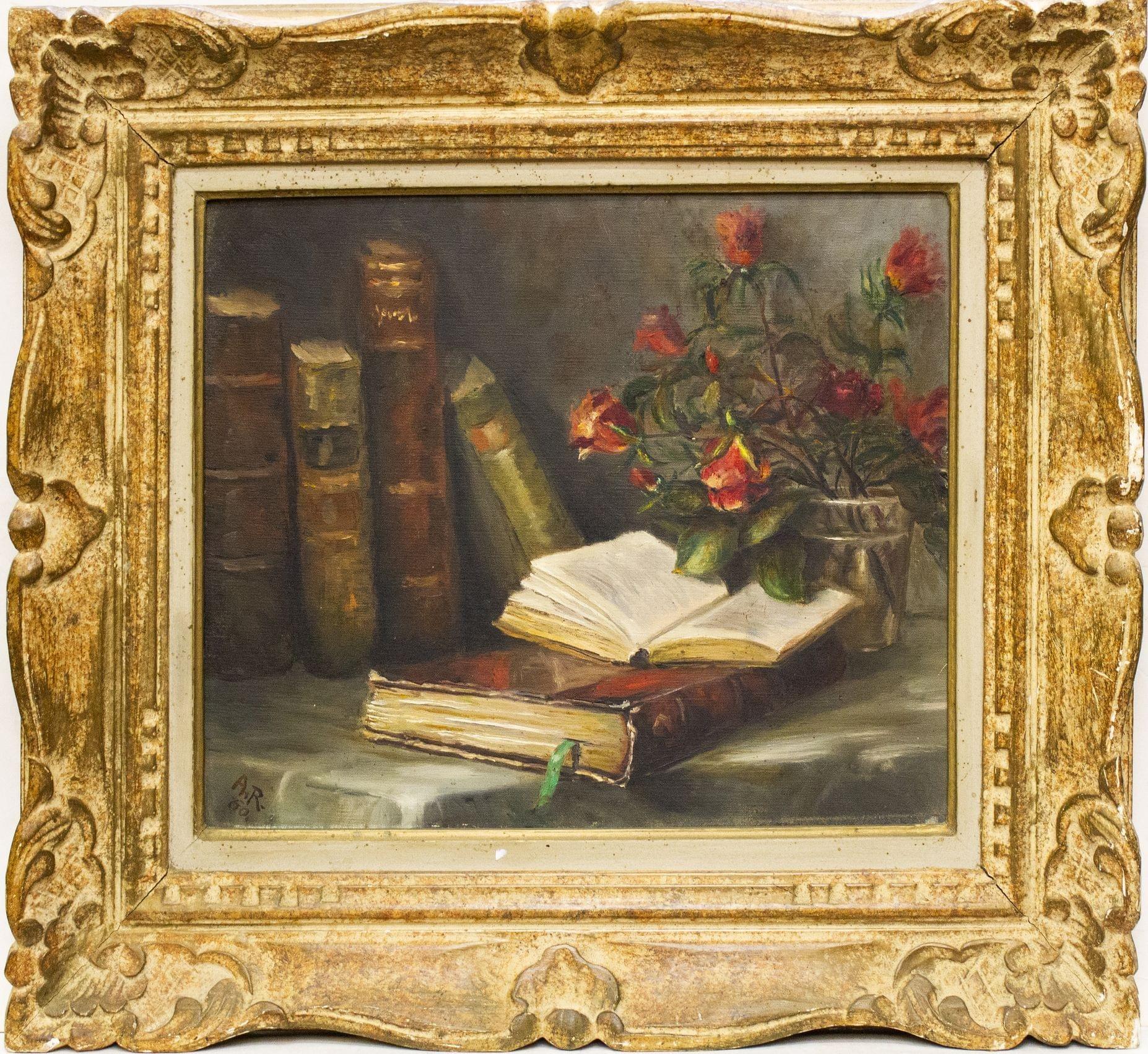 Nature morte aux livres et vase de fleurs, huile sur toile, monogrammée AR et datée 60, 33x41 cm
