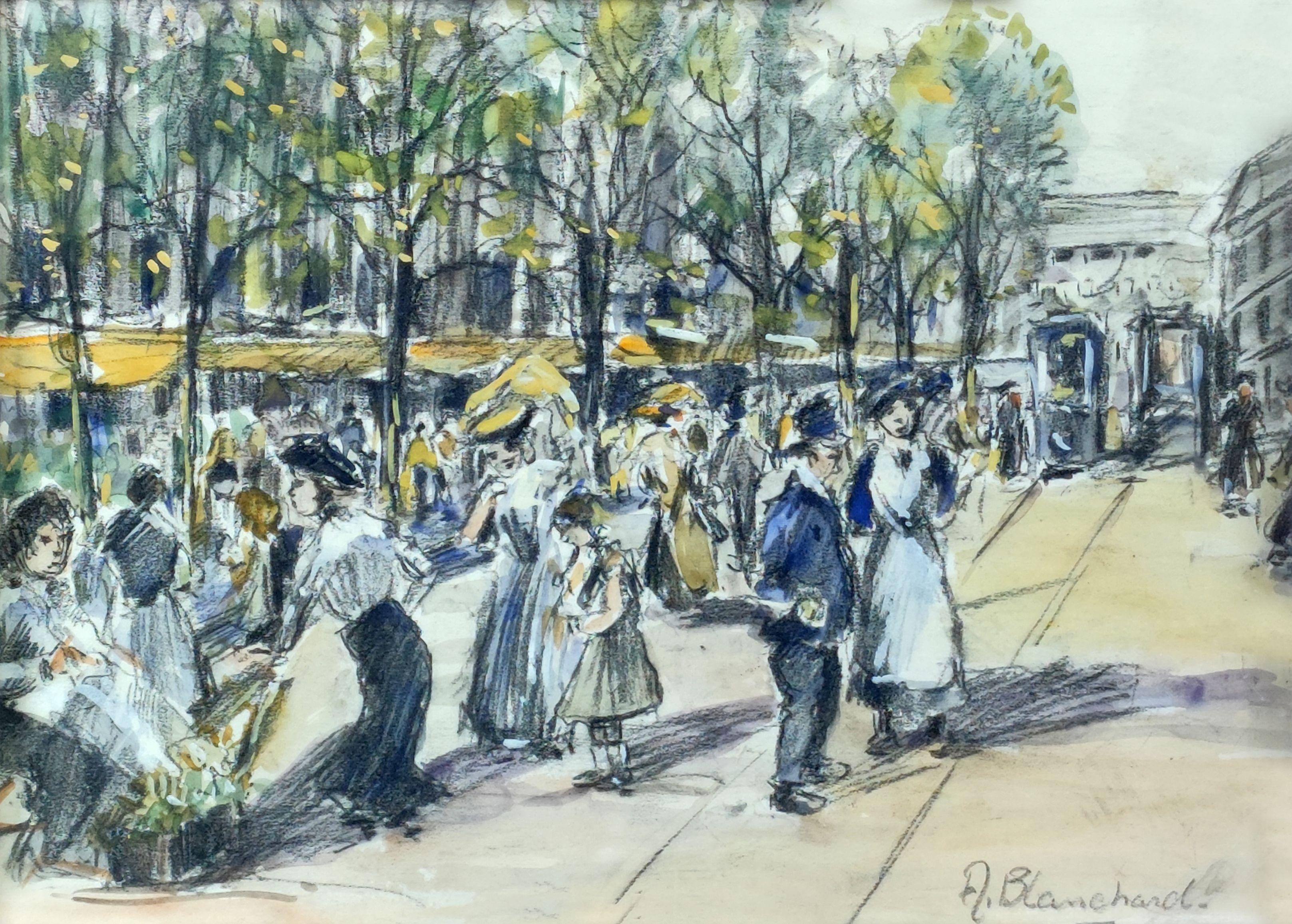 Rue animée, pastel sur papier, signé A.Blanchard, 29x40 cm